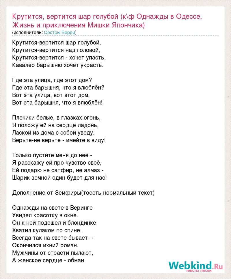 Крутится-вертится шар голубой, Крутится-вертится над головой, Крутится-вертится - хочет упасть, Кавалер барышню хочет украсть. Где эта улица, где этот дом? Где эта барышня, что я влюблён? Вот эта улица, вот этот дом, Вот эта барышня, что я влюблён! Плечики белые, в глазках огонь, Я положу ей на сердце ладонь, Лаской из дома с собой уведу. Верьте-не верьте - имейте в виду! Только пустите меня до неё - Я расскажу ей про чувство своё, Ей подарю не сапфир, не алмаз - Шарик земной один будет для нас! Дополнение от Земфиры(тоесть нормальный текст) Однажды на свете в Веринге Увидел красотку в окне. Он к ней подошел и блондинке Хватил кулаком по спине. Всегда так на свете бывает – Окончился ихний роман. Мужчины от страсти пылают, А женское сердце - обман.