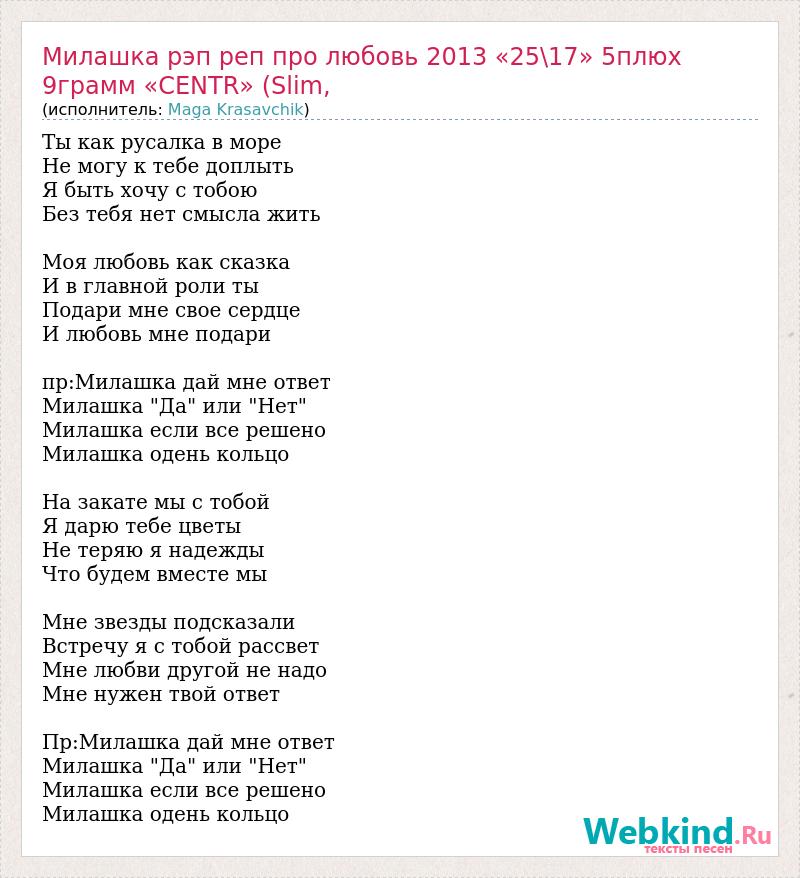 Милашка рэп реп про любовь 2013 «25\17» 5плюх 9грамм «CENTR» (Slim,