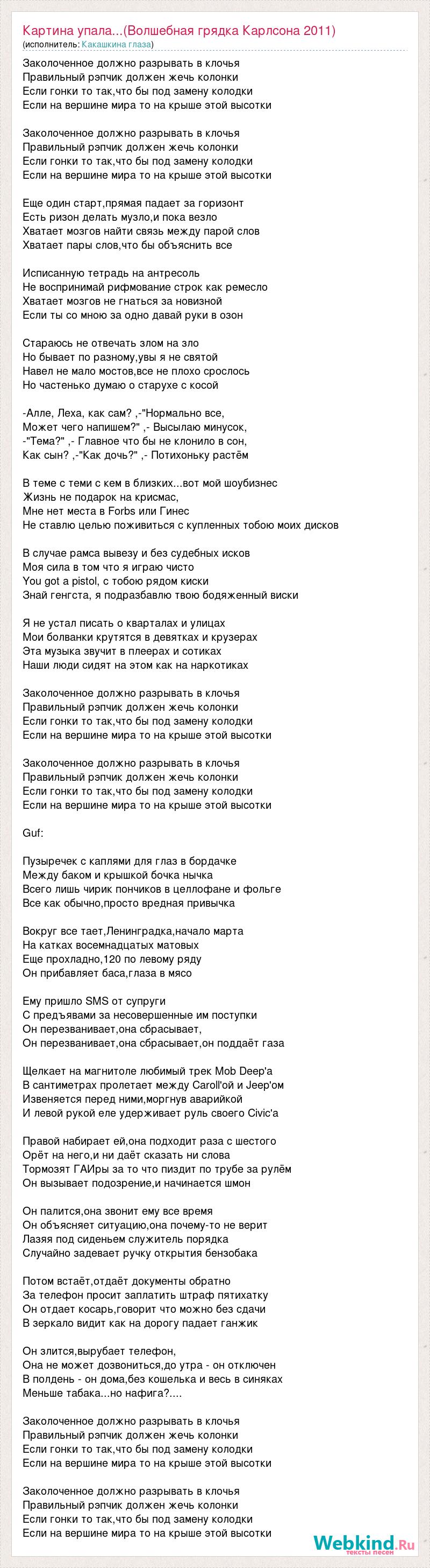 Заколоченное должно разрывать в клочья Правильный рэпчик должен жечь колонки Если гонки то так,что бы под замену колодки Если на вершине мира то на крыше этой высотки Заколоченное должно разрывать в клочья Правильный рэпчик должен жечь колонки Если гонки то так,что бы под замену колодки Если на вершине мира то на крыше этой высотки Еще один старт,прямая падает за горизонт Есть ризон делать музло,и пока везло Хватает мозгов найти связь между парой слов Хватает пары слов,что бы объяснить все Исписанную тетрадь на антресоль Не воспринимай рифмование строк как ремесло Хватает мозгов не гнаться за новизной Если ты со мною за одно давай руки в озон Стараюсь не отвечать злом на зло Но бывает по разному,увы я не святой Навел не мало мостов,все не плохо срослось Но частенько думаю о старухе с косой -Алле, Леха, как сам? ,-"Нормально все, Может чего напишем?" ,- Высылаю минусок, -"Тема?" ,- Главное что бы не клонило в сон, Как сын? ,-"Как дочь?" ,- Потихоньку растём В теме с теми с кем в близких...вот мой шоубизнес Жизнь не подарок на крисмас, Мне нет места в Forbs или Гинес Не ставлю целью поживиться с купленных тобою моих дисков В случае рамса вывезу и без судебных исков Моя сила в том что я играю чисто You got a pistol, с тобою рядом киски Знай генгста, я подразбавлю твою бодяженный виски Я не устал писать о кварталах и улицах Мои болванки крутятся в девятках и крузерах Эта музыка звучит в плеерах и сотиках Наши люди сидят на этом как на наркотиках Заколоченное должно разрывать в клочья Правильный рэпчик должен жечь колонки Если гонки то так,что бы под замену колодки Если на вершине мира то на крыше этой высотки Заколоченное должно разрывать в клочья Правильный рэпчик должен жечь колонки Если гонки то так,что бы под замену колодки Если на вершине мира то на крыше этой высотки Guf: Пузыречек с каплями для глаз в бордачке Между баком и крышкой бочка нычка Всего лишь чирик пончиков в целлофане и фольге Все как обычно,просто вредная привычка Вокруг все тает,Ленинградка,начало марта На катках восемнадцатых матовых Еще прохладно,120 по левому ряду Он прибавляет баса,глаза в мясо Ему пришло SMS от супруги С предъявами за несовершенные им поступки Он перезванивает,она сбрасывает, Он перезванивает,она сбрасывает,он поддаёт газа Щелкает на магнитоле любимый трек Mob Deep'a В сантиметрах пролетает между Caroll'ой и Jeep'ом Извеняется перед ними,моргнув аварийкой И левой рукой еле удерживает руль своего Civic'а Правой набирает ей,она подходит раза с шестого Орёт на него,и ни даёт сказать ни слова Тормозят ГАИры за то что пиздит по трубе за рулём Он вызывает подозрение,и начинается шмон Он палится,она звонит ему все время Он объясняет ситуацию,она почему-то не верит Лазяя под сиденьем служитель порядка Случайно задевает ручку открытия бензобака Потом встаёт,отдаёт документы обратно За телефон просит заплатить штраф пятихатку Он отдает косарь,говорит что можно без сдачи В зеркало видит как на дорогу падает ганжик Он злится,вырубает телефон, Она не может дозвониться,до утра - он отключен В полдень - он дома,без кошелька и весь в синяках Меньше табака...но нафига?.... Заколоченное должно разрывать в клочья Правильный рэпчик должен жечь колонки Если гонки то так,что бы под замену колодки Если на вершине мира то на крыше этой высотки Заколоченное должно разрывать в клочья Правильный рэпчик долже