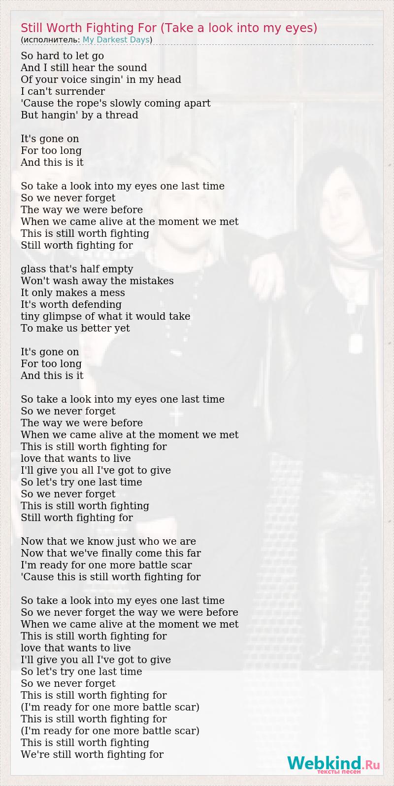 So hard to let go And I still hear the sound Of your voice singin' in my head I can't surrender 'Cause the rope's slowly coming apart But hangin' by a thread It's gone on For too long And this is it So take a look into my eyes one last time So we never forget The way we were before When we came alive at the moment we met This is still worth fighting Still worth fighting for glass that's half empty Won't wash away the mistakes It only makes a mess It's worth defending tiny glimpse of what it would take To make us better yet It's gone on For too long And this is it So take a look into my eyes one last time So we never forget The way we were before When we came alive at the moment we met This is still worth fighting for love that wants to live I'll give you all I've got to give So let's try one last time So we never forget This is still worth fighting Still worth fighting for Now that we know just who we are Now that we've finally come this far I'm ready for one more battle scar 'Cause this is still worth fighting for So take a look into my eyes one last time So we never forget the way we were before When we came alive at the moment we met This is still worth fighting for love that wants to live I'll give you all I've got to give So let's try one last time So we never forget This is still worth fighting for (I'm ready for one more battle scar) This is still worth fighting for (I'm ready for one more battle scar) This is still worth fighting We're still worth fighting for