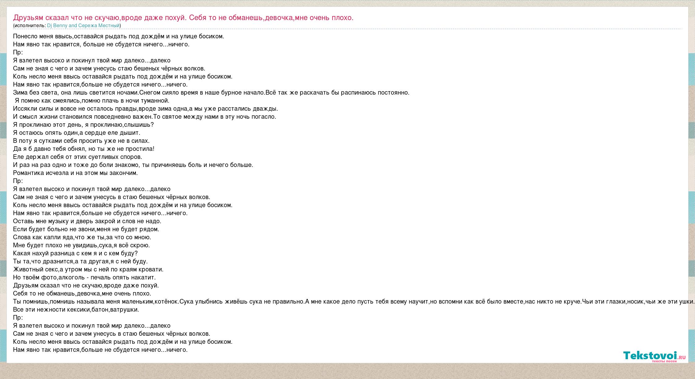 Главная→Исполнители→Dj Benny and Сережа Местный→Друзьям сказал что не скучаю,вроде даже похуй. Себя то не обманешь,девоч