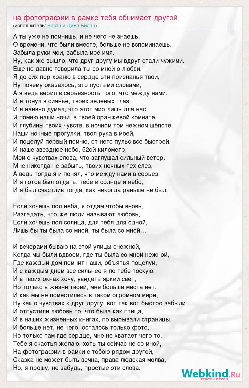 А ты уже не помнишь, и не чего не знаешь, О времени, что были вместе, больше не вспоминаешь. Забыла руки мои, забыла моё имя. Ну, как же вышло, что друг другу мы вдруг стали чужими. Еще не давно говорила ты со мной о любви, Я до сих пор храню в сердце эти признанья твои, Ну почему оказалось, это пустыми словами, А я ведь верил в серьезность того, что между нами. И я тонул в сиянье, твоих зеленых глаз, И я наивно думал, что этот мир лишь для нас, Я помню наши ночи, в твоей оранжевой комнате, И глубины твоих чувств, в ночном том нежном шёпоте. Наши ночные прогулки, твоя рука в моей, И поцелуй первый помню, от него пульс все быстрей. И наше звездное небо, 52ой километр, Мои о чувствах слова, что заглушал сильный ветер. Мне никогда не забыть, твоих ночных тех слез, А ведь тогда я и понял, что между нами в серьез, И я готов был отдать, тебе и солнце и небо, И я был счастлив тогда, как никогда раньше не был. Если хочешь пол неба, я отдам чтобы вновь, Разгадать, что же люди называют любовь, Если хочешь пол солнца, для тебя для одной, Лишь бы ты была со мной, ты была со мной… И вечерами бываю на этой улицы снежной, Когда мы были вдвоем, где ты была со мной нежной, Где каждый дом помнит наши, объятья поцелуи, И с каждым днем все сильнее я по тебе тоскую. И в твоих окнах хочу, увидеть яркий свет, Но только в жизни твоей, мне больше места нет. И как мы не поместились в таком огромном мире, Ну как о чувствах к друг другу, вот так вот быстро забыли. И отпустили любовь то, что была как птица, И в наших жизненных книгах, по вырывали страницы, И больше нет, не чего, осталось только фото, Но только там где сердце, мне не хватает чего то. Тебе я счастья желаю, хоть ты сейчас не со мной, На фотографии в рамки с тобою рядом другой, Сказка не может быть вечна, права людская молва, Но, я прошу, не забудь, простые эти слова.