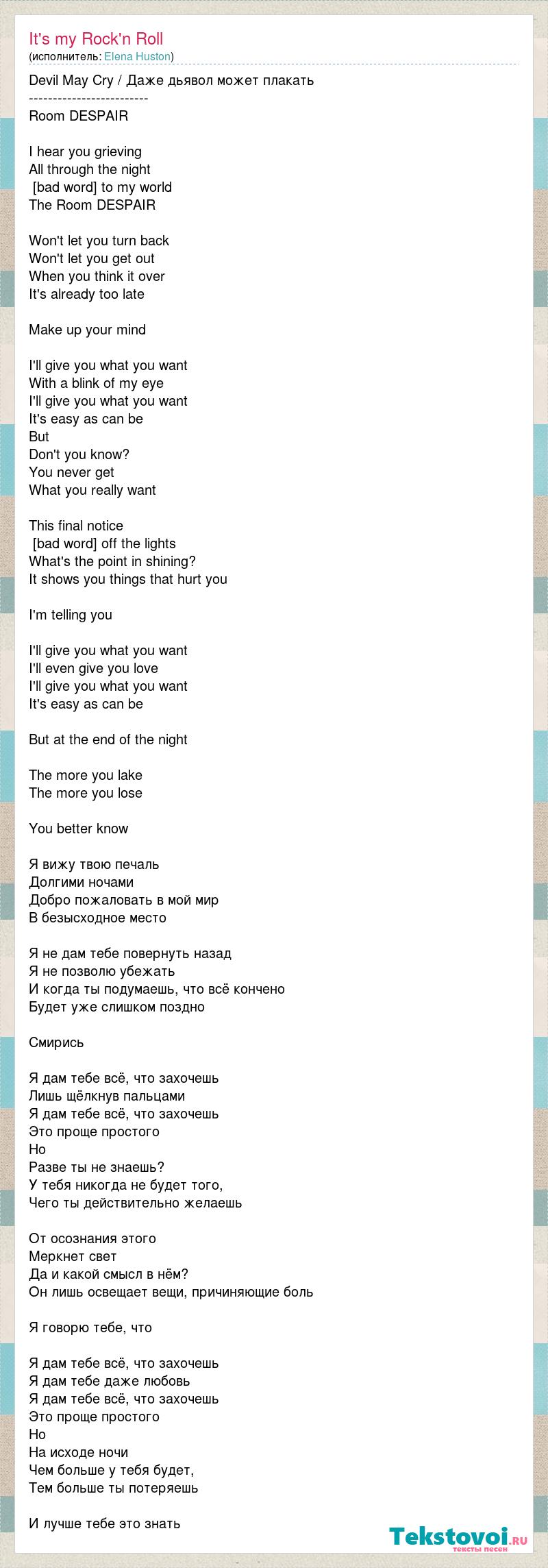 Devil May Cry / Даже дьявол может плакать ------------------------- Room DESPAIR I hear you grieving All through the night [bad word] to my world The Room DESPAIR Won't let you turn back Won't let you get out When you think it over It's already too late Make up your mind I'll give you what you want With a blink of my eye I'll give you what you want It's easy as can be But Don't you know? You never get What you really want This final notice [bad word] off the lights What's the point in shining? It shows you things that hurt you I'm telling you I'll give you what you want I'll even give you love I'll give you what you want It's easy as can be But at the end of the night The more you lake The more you lose You better know Я вижу твою печаль Долгими ночами Добро пожаловать в мой мир В безысходное место Я не дам тебе повернуть назад Я не позволю убежать И когда ты подумаешь, что всё кончено Будет уже слишком поздно Смирись Я дам тебе всё, что захочешь Лишь щёлкнув пальцами Я дам тебе всё, что захочешь Это проще простого Но Разве ты не знаешь? У тебя никогда не будет того, Чего ты действительно желаешь От осознания этого Меркнет свет Да и какой смысл в нём? Он лишь освещает вещи, причиняющие боль Я говорю тебе, что Я дам тебе всё, что захочешь Я дам тебе даже любовь Я дам тебе всё, что захочешь Это проще простого Но На исходе ночи Чем больше у тебя будет, Тем больше ты потеряешь И лучше тебе это знать