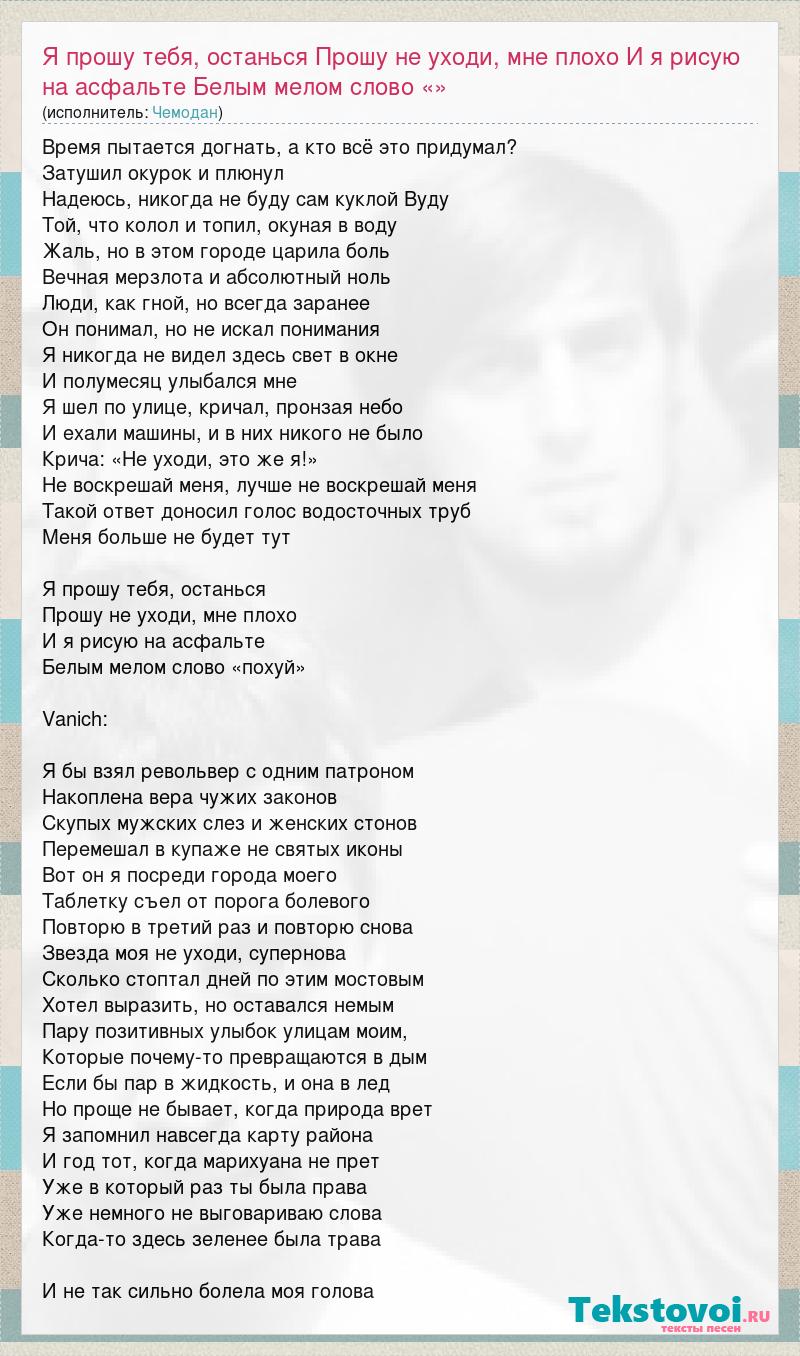 Главная→Исполнители→Чемодан→Я прошу тебя, останься Прошу не уходи, мне плохо И я рисую на асфальте Белы