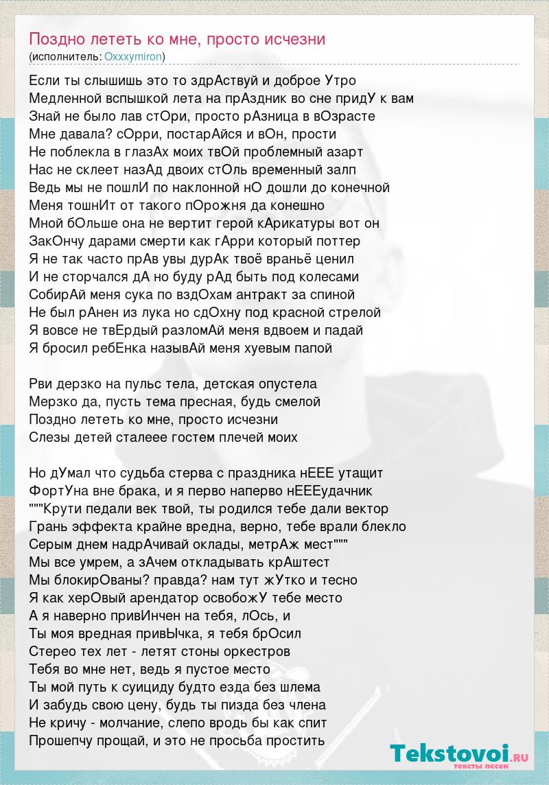 Если ты слышишь это то здрАствуй и доброе Утро Медленной вспышкой лета на прАздник во сне придУ к вам Знай не было лав стОри, просто рАзница в вОзрасте Мне давала? сОрри, постарАйся и вОн, прости Не поблекла в глазАх моих твОй проблемный азарт Нас не склеет назАд двоих стОль временный залп Ведь мы не пошлИ по наклонной нО дошли до конечной Меня тошнИт от такого пОрожня да конешно Мной бОльше она не вертит герой кАрикатуры вот он ЗакОнчу дарами смерти как гАрри который поттер Я не так часто прАв увы дурАк твоё враньё ценил И не сторчался дА но буду рАд быть под колесами СобирАй меня сука по вздОхам антракт за спиной Не был рАнен из лука но сдОхну под красной стрелой Я вовсе не твЕрдый разломАй меня вдвоем и падай Я бросил ребЕнка назывАй меня хуевым папой Рви дерзко на пульс тела, детская опустела Мерзко да, пусть тема пресная, будь смелой Поздно лететь ко мне, просто исчезни Слезы детей сталеее гостем плечей моих Но дУмал что судьба стерва с праздника нЕЕЕ утащит ФортУна вне брака, и я перво наперво нЕЕЕудачник """Крути педали век твой, ты родился тебе дали вектор Грань эффекта крайне вредна, верно, тебе врали блекло Серым днем надрАчивай оклады, метрАж мест""" Мы все умрем, а зАчем откладывать крАштест Мы блокирОваны? правда? нам тут жУтко и тесно Я как херОвый арендатор освобожУ тебе место А я наверно привИнчен на тебя, лОсь, и Ты моя вредная привЫчка, я тебя брОсил Стерео тех лет - летят стоны оркестров Тебя во мне нет, ведь я пустое место Ты мой путь к суициду будто езда без шлема И забудь свою цену, будь ты пизда без члена Не кричу - молчание, слепо вродь бы как спит Прошепчу прощай, и это не просьба простить