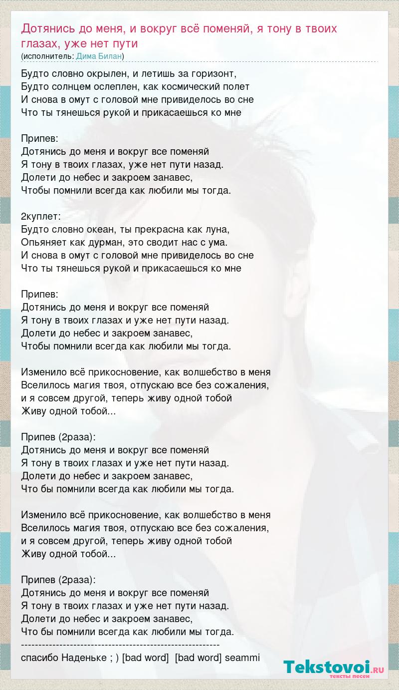 Главная→Исполнители→Дима Билан→Дотянись до меня, и вокруг всё поменяй, я тону в твоих глазах, уже нет