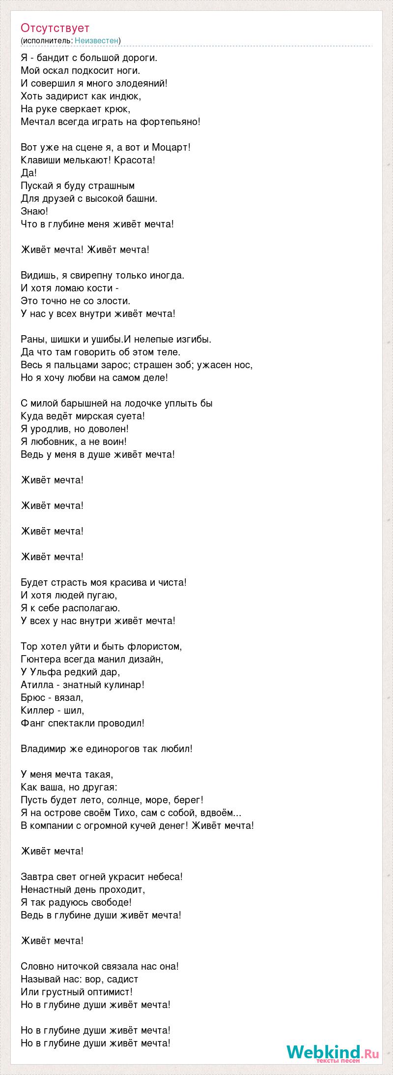 Я - бандит с большой дороги. Мой оскал подкосит ноги. И совершил я много злодеяний! Хоть задирист как индюк, На руке сверкает крюк, Мечтал всегда играть на фортепьяно! Вот уже на сцене я, а вот и Моцарт! Клавиши мелькают! Красота! Да! Пускай я буду страшным Для друзей с высокой башни. Знаю! Что в глубине меня живёт мечта! Живёт мечта! Живёт мечта! Видишь, я свирепну только иногда. И хотя ломаю кости - Это точно не со злости. У нас у всех внутри живёт мечта! Раны, шишки и ушибы.И нелепые изгибы. Да что там говорить об этом теле. Весь я пальцами зарос; страшен зоб; ужасен нос, Но я хочу любви на самом деле! С милой барышней на лодочке уплыть бы Куда ведёт мирская суета! Я уродлив, но доволен! Я любовник, а не воин! Ведь у меня в душе живёт мечта! Живёт мечта! Живёт мечта! Живёт мечта! Живёт мечта! Будет страсть моя красива и чиста! И хотя людей пугаю, Я к себе располагаю. У всех у нас внутри живёт мечта! Тор хотел уйти и быть флористом, Гюнтера всегда манил дизайн, У Ульфа редкий дар, Атилла - знатный кулинар! Брюс - вязал, Киллер - шил, Фанг спектакли проводил! Владимир же единорогов так любил! У меня мечта такая, Как ваша, но другая: Пусть будет лето, солнце, море, берег! Я на острове своём Тихо, сам с собой, вдвоём... В компании с огромной кучей денег! Живёт мечта! Живёт мечта! Завтра свет огней украсит небеса! Ненастный день проходит, Я так радуюсь свободе! Ведь в глубине души живёт мечта! Живёт мечта! Словно ниточкой связала нас она! Называй нас: вор, садист Или грустный оптимист! Но в глубине души живёт мечта! Но в глубине души живёт мечта! Но в глубине души живёт мечта!