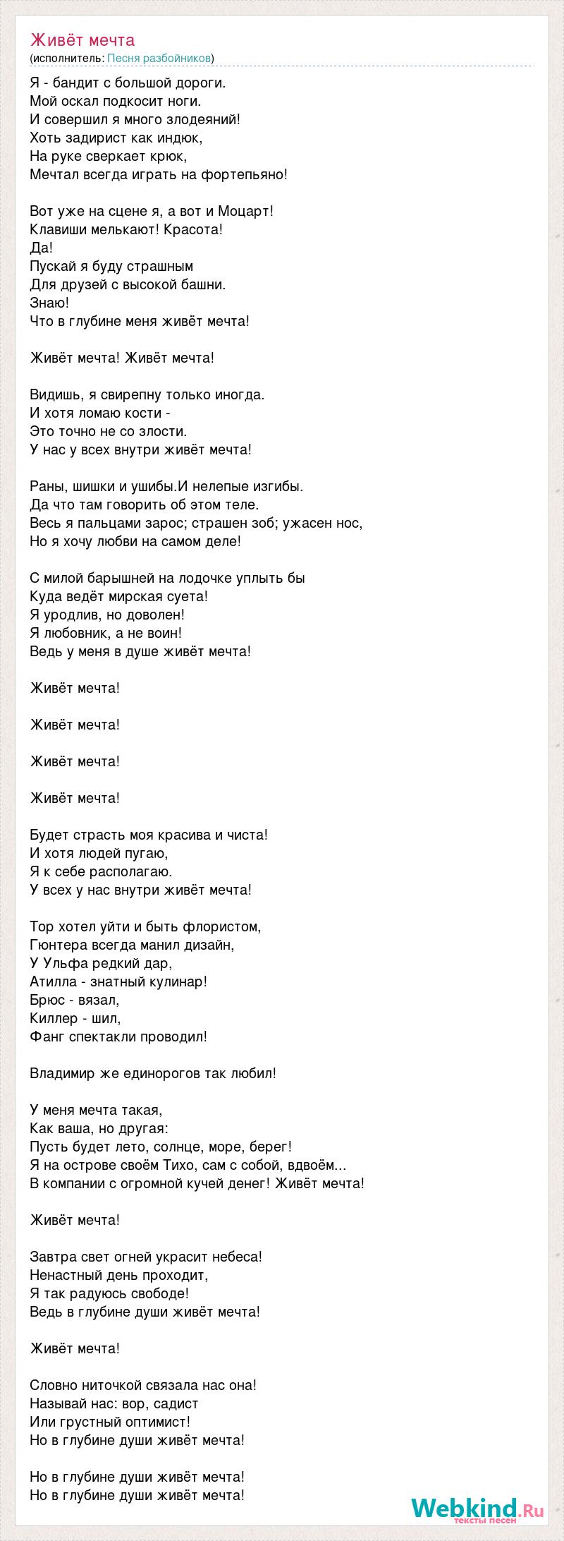 Я - бандит с большой дороги. Мой оскал подкосит ноги. И совершил я много злодеяний! Хоть задирист как индюк, На руке сверкает крюк, Мечтал всегда играть на фортепьяно! Вот уже на сцене я, а вот и Моцарт! Клавиши мелькают! Красота! Да! Пускай я буду страшным Для друзей с высокой башни. Знаю! Что в глубине меня живёт мечта! Живёт мечта! Живёт мечта! Видишь, я свирепну только иногда. И хотя ломаю кости - Это точно не со злости. У нас у всех внутри живёт мечта! Раны, шишки и ушибы.И нелепые изгибы. Да что там говорить об этом теле. Весь я пальцами зарос; страшен зоб; ужасен нос, Но я хочу любви на самом деле! С милой барышней на лодочке уплыть бы Куда ведёт мирская суета! Я уродлив, но доволен! Я любовник, а не воин! Ведь у меня в душе живёт мечта! Живёт мечта! Живёт мечта! Живёт мечта! Живёт мечта! Будет страсть моя красива и чиста! И хотя людей пугаю, Я к себе располагаю. У всех у нас внутри живёт мечта! Тор хотел уйти и быть флористом, Гюнтера всегда манил дизайн, У Ульфа редкий дар, Атилла - знатный кулинар! Брюс - вязал, Киллер - шил, Фанг спектакли проводил! Владимир же единорогов так любил! У меня мечта такая, Как ваша, но другая: Пусть будет лето, солнце, море, берег! Я на острове своём Тихо, сам с собой, вдвоём... В компании с огромной кучей денег! Живёт мечта! Живёт мечта! Завтра свет огней украсит небеса! Ненастный день проходит, Я так радуюсь свободе! Ведь в глубине души живёт мечта! Живёт мечта! Словно ниточкой связала нас она! Называй нас: вор, садист Или грустный оптимист! Но в глубине души живёт мечта! Но в глубине души живёт мечта! Но в глубине души живёт мечта!