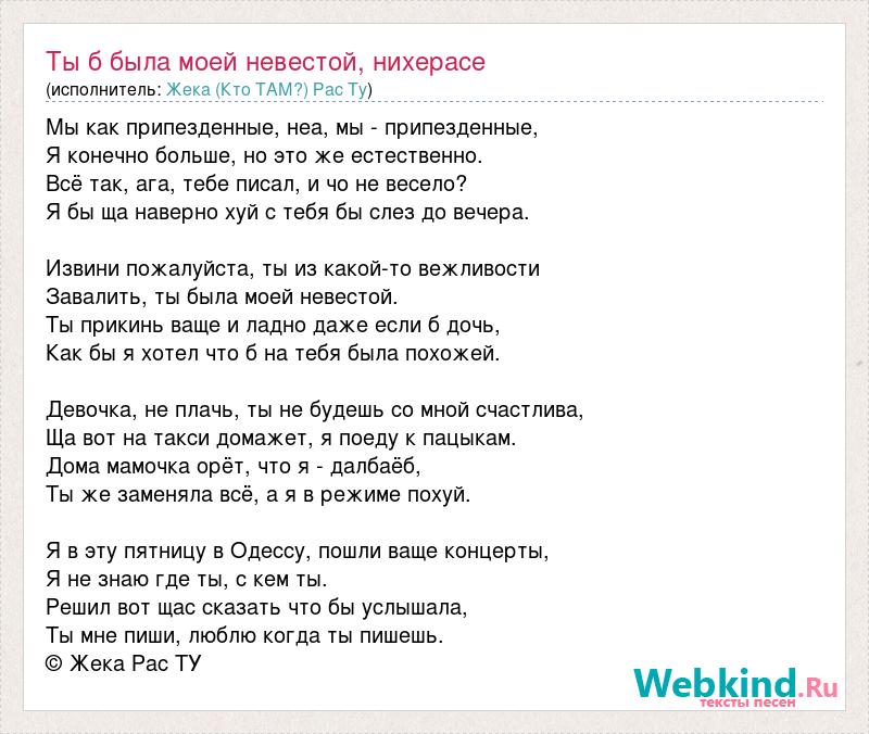 Мы как припезденные, неа, мы - припезденные, Я конечно больше, но это же естественно. Всё так, ага, тебе писал, и чо не весело? Я бы ща наверно хуй с тебя бы слез до вечера. Извини пожалуйста, ты из какой-то вежливости Завалить, ты была моей невестой. Ты прикинь ваще и ладно даже если б дочь, Как бы я хотел что б на тебя была похожей. Девочка, не плачь, ты не будешь со мной счастлива, Ща вот на такси домажет, я поеду к пацыкам. Дома мамочка орёт, что я - далбаёб, Ты же заменяла всё, а я в режиме похуй. Я в эту пятницу в Одессу, пошли ваще концерты, Я не знаю где ты, с кем ты. Решил вот щас сказать что бы услышала, Ты мне пиши, люблю когда ты пишешь. © Жека Рас ТУ