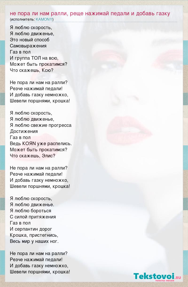 Я люблю скорость, Я люблю движенье, Это новый способ Самовыражения Газ в пол И группа ТОЛ на всю, Может быть прокатимся? Что скажешь, Ксю? Не пора ли нам на ралли? Резче нажимай педали! И добавь газку немножко, Шевели поршнями, крошка! Я люблю скорость, Я люблю движенье, Я люблю свежие прогресса Достижения Газ в пол Ведь КОЯN уже распелись. Может быть прокатимся? Что скажешь, Элис? Не пора ли нам на ралли? Резче нажимай педали! И добавь газку немножко, Шевели поршнями, крошка! Я люблю скорость, Я люблю движенье. Я люблю бороться С силой притяжения Газ в пол И серпантин дорог Крошка, пристегнись, Весь мир у наших ног. Не пора ли нам на ралли? Резче нажимай педали! И добавь газку немножко, Шевели поршнями, крошка!
