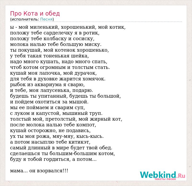 ы - мой миленький, хорошенький, мой котик, положу тебе сарделечку я в ротик, положу тебе колбаску и сосиску, молока налью тебе большую миску. ты покушай, мой котенок хорошенько, у тебя такая тоненькая шейка, надо много кушать, надо много спать, чтоб котом огромным и толстым стать. кушай моя лапочка, мой дурачок, для тебя в духовке жарится хомячок. рыбок из аквариума я сварю, и тебе, моя лапусенька, подарю. будешь ты упитанный, будешь ты большой, и пойдем охотиться за мышой. мы ее поймаем и сварим суп, с луком и капустой, мышиный труп. толстый мой, претолстый, мой жирный кот, после молока налью тебе компот, кушай осторожно, не подавись, ух ты моя рожа, мяу-мяу, кысь-кысь. а потом насыплю тебе китикэт, самый длинный в мире будет твой обед. сделаешься ты большим-большим котом, буду я тобой гордиться, а потом... мама... он взорвался!!!