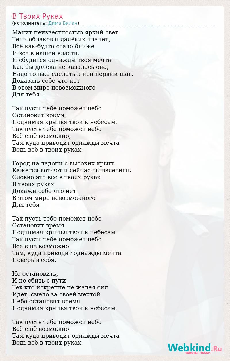 Манит неизвестностью яркий свет Тени облаков и далёких планет, Всё как-будто стало ближе И всё в нашей власти. И сбудится однажды твоя мечта Как бы долека не казалась она, Надо только сделать к ней первый шаг. Доказать себе что нет В этом мире невозможного Для тебя... Так пусть тебе поможет небо Остановит время, Поднимая крылья твои к небесам. Так пусть тебе поможет небо Всё ещё возможно, Там куда приводит однажды мечта Ведь всё в твоих руках. Город на ладони с высоких крыш Кажется вот-вот и сейчас ты взлетишь Словно это всё в твоих руках В твоих руках Докажи себе что нет В этом мире невозможного Для тебя Так пусть тебе поможет небо Остановит время Поднимая крылья твои к небесам Так пусть тебе поможет небо Всё ещё возможно Там, куда приводит однажды мечта Поверь в себя. Не остановить, И не сбить с пути Тех кто искренне не жалея сил Идёт, смело за своей мечтой Небо остановит время Поднимая крылья твои к небесам. Так пусть тебе поможет небо Всё ещё возможно Там куда приводит однажды мечта Ведь всё в твоих руках.