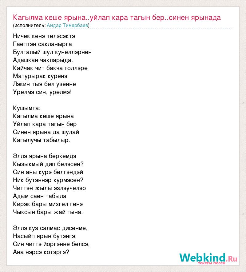 Ничек кенэ телэсэктэ Гаептэн сакланырга Булгалый шул кунеллэрнен Адашкан чакларыда. Кайчак чит бакча голлэре Матурырак куренэ Лэкин тыя бел узенне Урелмэ син, урелмэ! Кушымта: Кагылма кеше ярына Уйлап кара тагын бер Синен ярына да шулай Кагылучы табылыр. Эллэ ярына беркемдэ Кызыкмый дип белэсен? Син аны курэ белгэндэй Ник бутэннэр курмэсен? Читтэн жылы эзлэучелэр Адым саен табыла Кирэк бары мизгел генэ Чыксын бары жай гына. Эллэ куз салмас дисенме, Насыйп ярын бутэнгэ. Син читтэ йоргэнне белсэ, Ана нэрсэ котэргэ?