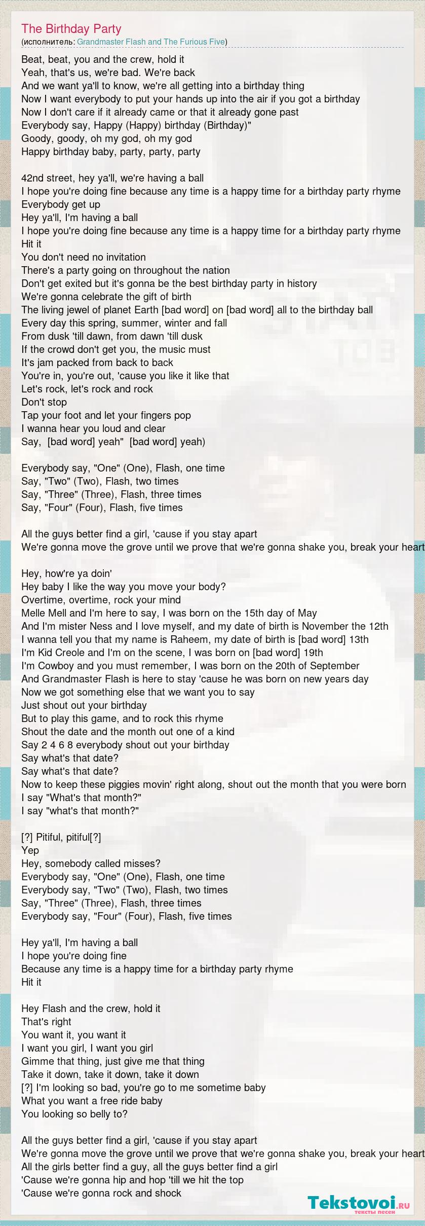 Beat, beat, you and the crew, hold it Yeah, that's us, we're bad. We're back And we want ya'll to know, we're all getting into a birthday thing Now I want everybody to put your hands up into the air if you got a birthday Now I don't care if it already came or that it already gone past Everybody say, Happy (Happy) birthday (Birthday)" Goody, goody, oh my god, oh my god Happy birthday baby, party, party, party 42nd street, hey ya'll, we're having a ball I hope you're doing fine because any time is a happy time for a birthday party rhyme Everybody get up Hey ya'll, I'm having a ball I hope you're doing fine because any time is a happy time for a birthday party rhyme Hit it You don't need no invitation There's a party going on throughout the nation Don't get exited but it's gonna be the best birthday party in history We're gonna celebrate the gift of birth The living jewel of planet Earth So come on, come all to the birthday ball Every day this spring, summer, winter and fall From dusk 'till dawn, from dawn 'till dusk If the crowd don't get you, the music must It's jam packed from back to back You're in, you're out, 'cause you like it like that Let's rock, let's rock and rock Don't stop Tap your foot and let your fingers pop I wanna hear you loud and clear Say, "Hell yeah" (Hell yeah) Everybody say, "One" (One), Flash, one time Say, "Two" (Two), Flash, two times Say, "Three" (Three), Flash, three times Say, "Four" (Four), Flash, five times All the guys better find a girl, 'cause if you stay apart We're gonna move the grove until we prove that we're gonna shake you, break your heart Hey, how're ya doin' Hey baby I like the way you move your body? Overtime, overtime, rock your mind Melle Mell and I'm here to say, I was born on the 15th day of May And I'm mister Ness and I love myself, and my date of birth is November the 12th I wanna tell you that my name is Raheem, my date of birth is February 13th I'm Kid Creole and I'm on the scene, I was born on February 19th I'm Cowboy and you must remember, I was born on the 20th of September And Grandmaster Flash is here to stay 'cause he was born on new years day Now we got something else that we want you to say Just shout out your birthday But to play this game, and to rock this rhyme Shout the date and the month out one of a kind Say 2 4 6 8 everybody shout out your birthday Say what's that date? Say what's that date? Now to keep these piggies movin' right along, shout out the month that you were born I say "What's that month?" I say "what's that month?" [?] Pitiful, pitiful[?] Yep Hey, somebody called misses? Everybody say, "One" (One), Flash, one time Everybody say, "Two" (Two), Flash, two times Say, "Three" (Three), Flash, three times Everybody say, "Four" (Four), Flash, five times Hey ya'll, I'm having a ball I hope you're doing fine Because any time is a happy time for a birthday party rhyme Hit it Hey Flash and the crew, hold it That's right You want it, you want it I want you girl, I want you girl Gimme that thing, just give me that thing Take it down, take it down, take it down [?] I'm looking so bad, you're go to me sometime baby What you want a free ride baby You looking so belly to? All the guys better find a girl, 'cause if you stay apart We're gonna move the grove until we prove that we're gonna shake you, break your heart All the girls better find a guy, all the guys better find a girl 'Cause we're gonna hip and hop 'till we hit the top 'Cause we're gonna rock and shock