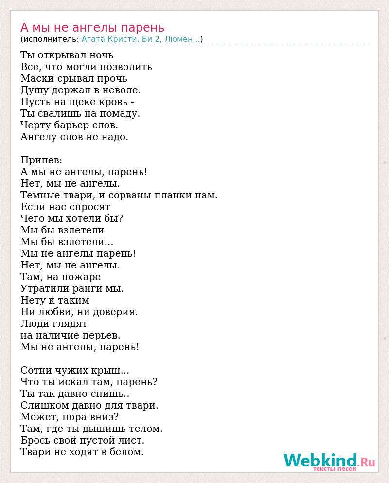 Ты открывал ночь Все, что могли позволить Маски срывал прочь Душу держал в неволе. Пусть на щеке кровь - Ты свалишь на помаду. Черту барьер слов. Ангелу слов не надо. Припев: А мы не ангелы, парень! Нет, мы не ангелы. Темные твари, и сорваны планки нам. Если нас спросят Чего мы хотели бы? Мы бы взлетели Мы бы взлетели... Мы не ангелы парень! Нет, мы не ангелы. Там, на пожаре Утратили ранги мы. Нету к таким Ни любви, ни доверия. Люди глядят на наличие перьев. Мы не ангелы, парень! Сотни чужих крыш... Что ты искал там, парень? Ты так давно спишь.. Слишком давно для твари. Может, пора вниз? Там, где ты дышишь телом. Брось свой пустой лист. Твари не ходят в белом.