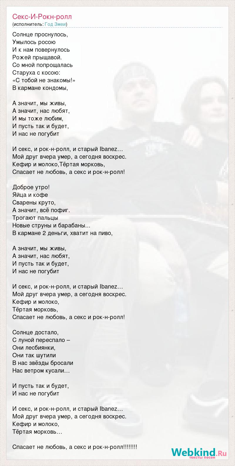 Солнце проснулось, Умылось росою И к нам повернулось Рожей прыщавой. Со мной попрощалась Старуха с косою: «С тобой не знакомы!» В кармане кондомы, А значит, мы живы, А значит, нас любят, И мы тоже любим, И пусть так и будет, И нас не погубит И секс, и рок-н-ролл, и старый Ibanez… Мой друг вчера умер, а сегодня воскрес. Кефир и молоко,Тёртая морковь, Спасает не любовь, а секс и рок-н-ролл! Доброе утро! Яйца и кофе Сварены круто, А значит, всё пофиг. Трогают пальцы Новые струны и барабаны... В кармане 2 деньги, хватит на пиво, А значит, мы живы, А значит, нас любят, И пусть так и будет, И нас не погубит И секс, и рок-н-ролл, и старый Ibanez… Мой друг вчера умер, а сегодня воскрес. Кефир и молоко, Тёртая морковь, Спасает не любовь, а секс и рок-н-ролл! Солнце достало, С луной переспало – Они лесбиянки, Они так шутили В нас звёзды бросали Нас ветром кусали… И пусть так и будет, И нас не погубит И секс, и рок-н-ролл, и старый Ibanez… Мой друг вчера умер, а сегодня воскрес. Кефир и молоко, Тёртая морковь… Спасает не любовь, а секс и рок-н-ролл!!!!!!!!
