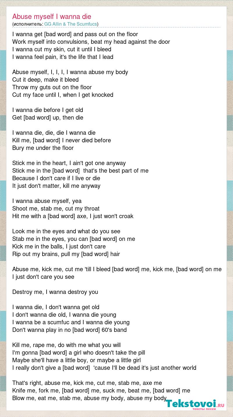 I wanna get drunk and pass out on the floor Work myself into convulsions, beat my head against the door I wanna cut my skin, cut it until I bleed I wanna feel pain, it's the life that I lead Abuse myself, I, I, I, I wanna abuse my body Cut it deep, make it bleed Throw my guts out on the floor Cut my face until I, when I get knocked I wanna die before I get old Get [bad word] up, then die I wanna die, die, die I wanna die Kill me, [bad word] I never died before Bury me under the floor Stick me in the heart, I ain't got one anyway Stick me in the [bad word] that's the best part of me Because I don't care if I live or die It just don't matter, kill me anyway I wanna abuse myself, yea Shoot me, stab me, cut my throat Hit me with a [bad word] axe, I just won't croak Look me in the eyes and what do you see Stab me in the eyes, you can [bad word] on me Kick me in the balls, I just don't care Rip out my brains, pull my [bad word] hair Abuse me, kick me, cut me 'till I bleed [bad word] me, kick me, [bad word] on me I just don't care you see Destroy me, I wanna destroy you I wanna die, I don't wanna get old I don't wanna die old, I wanna die young I wanna be a scumfuc and I wanna die young Don't wanna play in no [bad word] 60's band Kill me, rape me, do with me what you will I'm gonna [bad word] a girl who doesn't take the pill Maybe she'll have a little boy, or maybe a little girl I really don't give a [bad word] 'cause I'll be dead it's just another world That's right, abuse me, kick me, cut me, stab me, axe me Knife me, fork me, [bad word] me, suck me, beat me, [bad word] me Blow me, eat me, stab me, abuse my body, abuse my body