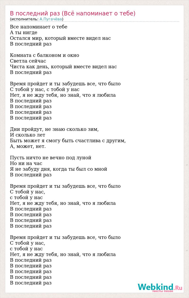 Все напоминает о тебе А ты нигде Остался мир, который вместе видел нас В последний раз Комната с балконом и окно Светла сейчас Чиста как день, который вместе видел нас В последний раз Время пройдет и ты забудешь все, что было С тобой у нас, с тобой у нас Нет, я не жду тебя, но знай, что я любила В последний раз В последний раз В последний раз В последний раз Дни пройдут, не знаю сколько зим, И сколько лет Быть может я смогу быть счастлива с другим, А, может, нет. Пусть ничто не вечно под луной Но ни на час Я не забуду дня, когда ты был со мной В последний раз Время пройдет и ты забудешь все, что было С тобой у нас, с тобой у нас Нет, я не жду тебя, но знай, что я любила В последний раз В последний раз В последний раз В последний раз Время пройдет и ты забудешь все, что было С тобой у нас, с тобой у нас Нет, я не жду тебя, но знай, что я любила В последний раз В последний раз В последний раз В последний раз В последний раз