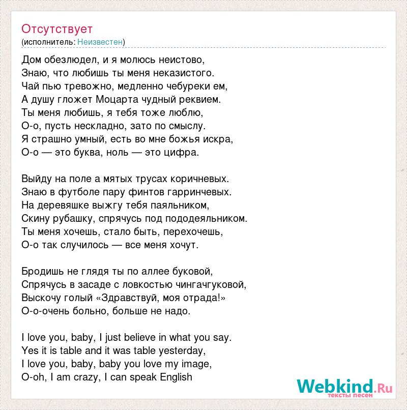 Дом обезлюдел, и я молюсь неистово, Знаю, что любишь ты меня неказистого. Чай пью тревожно, медленно чебуреки ем, А душу гложет Моцарта чудный реквием. Ты меня любишь, я тебя тоже люблю, О-о, пусть нескладно, зато по смыслу. Я страшно умный, есть во мне божья искра, О-о — это буква, ноль — это цифра. Выйду на поле а мятых трусах коричневых. Знаю в футболе пару финтов гарринчевых. На деревяшке выжгу тебя паяльником, Скину рубашку, спрячусь под пододеяльником. Ты меня хочешь, стало быть, перехочешь, О-о так случилось — все меня хочут. Бродишь не глядя ты по аллеe буковой, Спрячусь в засаде с ловкостью чингачгуковой, Выскочу голый «Здравствуй, моя отрада!» О-о-очень больно, больше не надо. I love you, baby, I just believe in what you say. Yes it is table and it was table yesterday, I love you, baby, baby you love my image, O-oh, I am crazy, I can speak English