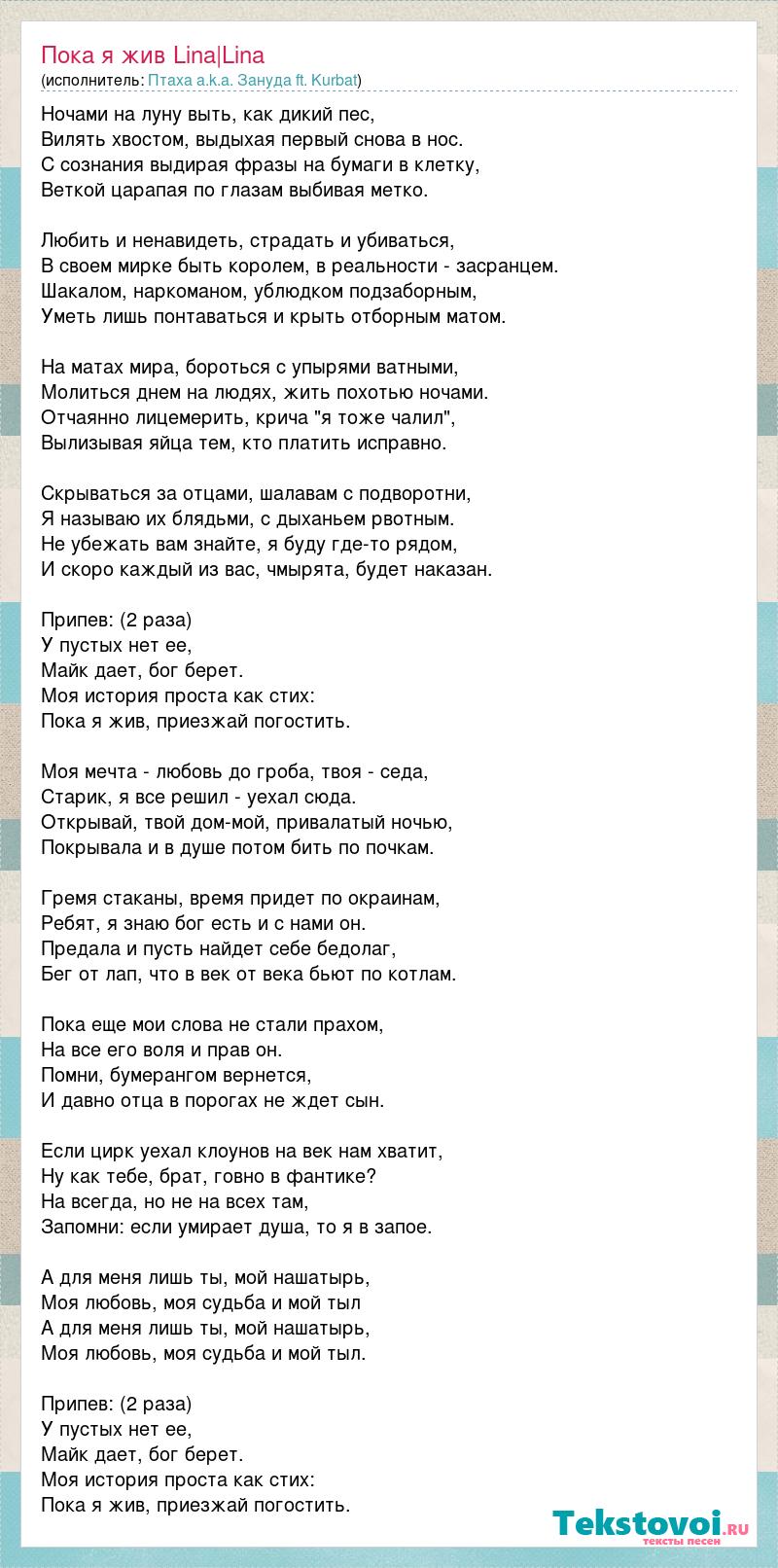 Ночами на луну выть, как дикий пес, Вилять хвостом, выдыхая первый снова в нос. С сознания выдирая фразы на бумаги в клетку, Веткой царапая по глазам выбивая метко. Любить и ненавидеть, страдать и убиваться, В своем мирке быть королем, в реальности - засранцем. Шакалом, наркоманом, ублюдком подзаборным, Уметь лишь понтаваться и крыть отборным матом. На матах мира, бороться с упырями ватными, Молиться днем на людях, жить похотью ночами. Отчаянно лицемерить, крича "я тоже чалил", Вылизывая яйца тем, кто платить исправно. Скрываться за отцами, шалавам с подворотни, Я называю их блядьми, с дыханьем рвотным. Не убежать вам знайте, я буду где-то рядом, И скоро каждый из вас, чмырята, будет наказан. Припев: (2 раза) У пустых нет ее, Майк дает, бог берет. Моя история проста как стих: Пока я жив, приезжай погостить. Моя мечта - любовь до гроба, твоя - седа, Старик, я все решил - уехал сюда. Открывай, твой дом-мой, привалатый ночью, Покрывала и в душе потом бить по почкам. Гремя стаканы, время придет по окраинам, Ребят, я знаю бог есть и с нами он. Предала и пусть найдет себе бедолаг, Бег от лап, что в век от века бьют по котлам. Пока еще мои слова не стали прахом, На все его воля и прав он. Помни, бумерангом вернется, И давно отца в порогах не ждет сын. Если цирк уехал клоунов на век нам хватит, Ну как тебе, брат, говно в фантике? На всегда, но не на всех там, Запомни: если умирает душа, то я в запое. А для меня лишь ты, мой нашатырь, Моя любовь, моя судьба и мой тыл А для меня лишь ты, мой нашатырь, Моя любовь, моя судьба и мой тыл. Припев: (2 раза) У пустых нет ее, Майк дает, бог берет. Моя история проста как стих: Пока я жив, приезжай погостить.