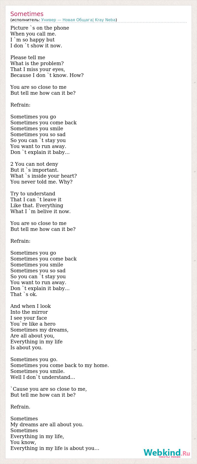 Picture `s on the phone When you call me. I `m so happy but I don `t show it now. Please tell me What is the problem? That I miss your eyes, Because I don `t know. How? You are so close to me But tell me how can it be? Refrain: Sometimes you go Sometimes you come back Sometimes you smile Sometimes you so sad So you can `t stay you You want to run away. Don `t explain it baby… 2 You can not deny But it `s important. What `s inside your heart? You never told me. Why? Try to understand That I can `t leave it Like that. Everything What I `m belive it now. You are so close to me But tell me how can it be? Refrain: Sometimes you go Sometimes you come back Sometimes you smile Sometimes you so sad So you can `t stay you You want to run away. Don `t explain it baby… That `s ok. And when I look Into the mirror I see your face You`re like a hero Sometimes my dreams, Are all about you, Everything in my life Is about you. Sometimes you go. Sometimes you come back to my home. Sometimes you smile. Well I don`t understand… `Cause you are so close to me, But tell me how can it be? Refrain. Sometimes My dreams are all about you. Sometimes Everything in my life, You know, Everything in my life is about you…