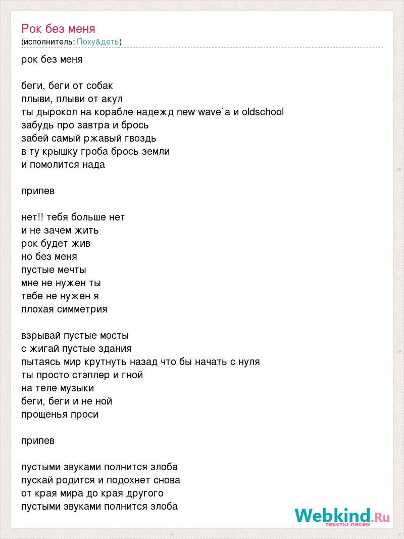 рок без меня беги, беги от собак плыви, плыви от акул ты дырокол на корабле надежд new wave`а и oldschool забудь про завтра и брось забей самый ржавый гвоздь в ту крышку гроба брось земли и помолится нада припев нет!! тебя больше нет и не зачем жить рок будет жив но без меня пустые мечты мне не нужен ты тебе не нужен я плохая симметрия взрывай пустые мосты с жигай пустые здания пытаясь мир крутнуть назад что бы начать с нуля ты просто стэплер и гной на теле музыки беги, беги и не ной прощенья проси припев пустыми звуками полнится злоба пускай родится и подохнет снова от края мира до края другого пустыми звуками полнится злоба