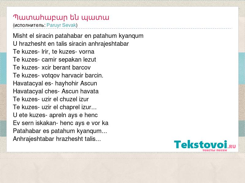 Misht el siracin patahabar en patahum kyanqum U hrazhesht en talis siracin anhrajeshtabar Te kuzes- lrir, te kuzes- vorna Te kuzes- camir sepakan lezut Te kuzes- xcir berant barcov Te kuzes- votqov harvacir barcin. Havatacyal es- hayhohir Ascun Havatacyal ches- Ascun havata Te kuzes- uzir el chuzel izur Te kuzes- uzir el chaprel izur... U ete kuzes- apreln ays e henc Ev sern iskakan- henc ays e vor ka Patahabar es patahum kyanqum... Anhrajeshtabar hrazhesht talis...