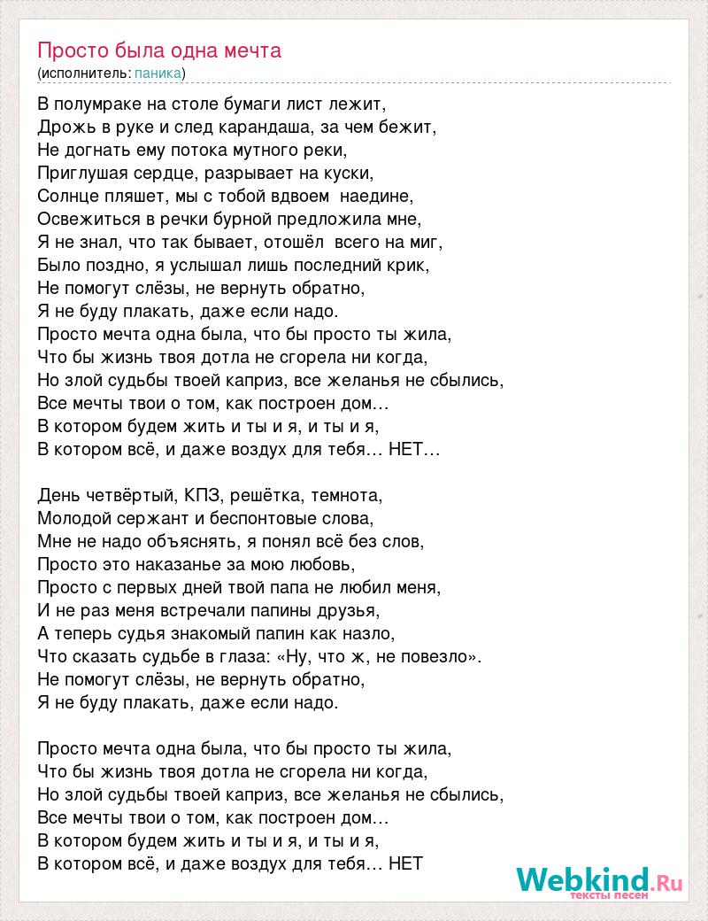 В полумраке на столе бумаги лист лежит, Дрожь в руке и след карандаша, за чем бежит, Не догнать ему потока мутного реки, Приглушая сердце, разрывает на куски, Солнце пляшет, мы с тобой вдвоем наедине, Освежиться в речки бурной предложила мне, Я не знал, что так бывает, отошёл всего на миг, Было поздно, я услышал лишь последний крик, Не помогут слёзы, не вернуть обратно, Я не буду плакать, даже если надо. Просто мечта одна была, что бы просто ты жила, Что бы жизнь твоя дотла не сгорела ни когда, Но злой судьбы твоей каприз, все желанья не сбылись, Все мечты твои о том, как построен дом… В котором будем жить и ты и я, и ты и я, В котором всё, и даже воздух для тебя… НЕТ… День четвёртый, КПЗ, решётка, темнота, Молодой сержант и беспонтовые слова, Мне не надо объяснять, я понял всё без слов, Просто это наказанье за мою любовь, Просто с первых дней твой папа не любил меня, И не раз меня встречали папины друзья, А теперь судья знакомый папин как назло, Что сказать судьбе в глаза: «Ну, что ж, не повезло». Не помогут слёзы, не вернуть обратно, Я не буду плакать, даже если надо. Просто мечта одна была, что бы просто ты жила, Что бы жизнь твоя дотла не сгорела ни когда, Но злой судьбы твоей каприз, все желанья не сбылись, Все мечты твои о том, как построен дом… В котором будем жить и ты и я, и ты и я, В котором всё, и даже воздух для тебя… НЕТ