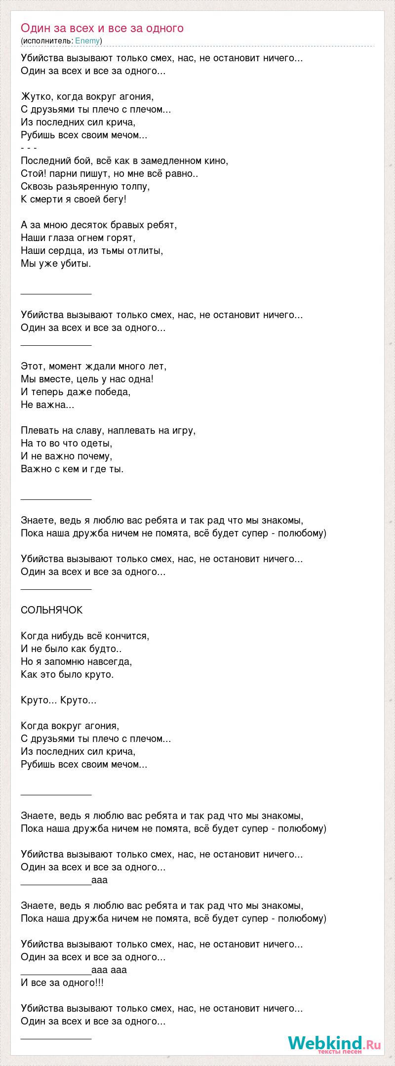 Убийства вызывают только смех, нас, не остановит ничего... Один за всех и все за одного... Жутко, когда вокруг агония, С друзьями ты плечо с плечом... Из последних сил крича, Рубишь всех своим мечом... - - - Последний бой, всё как в замедленном кино, Стой! парни пишут, но мне всё равно.. Сквозь разьяренную толпу, К смерти я своей бегу! А за мною десяток бравых ребят, Наши глаза огнем горят, Наши сердца, из тьмы отлиты, Мы уже убиты. _____________ Убийства вызывают только смех, нас, не остановит ничего... Один за всех и все за одного... _____________ Этот, момент ждали много лет, Мы вместе, цель у нас одна! И теперь даже победа, Не важна... Плевать на славу, наплевать на игру, На то во что одеты, И не важно почему, Важно с кем и где ты. _____________ Знаете, ведь я люблю вас ребята и так рад что мы знакомы, Пока наша дружба ничем не помята, всё будет супер - полюбому) Убийства вызывают только смех, нас, не остановит ничего... Один за всех и все за одного... _____________ СОЛЬНЯЧОК Когда нибудь всё кончится, И не было как будто.. Но я запомню навсегда, Как это было круто. Круто... Круто... Когда вокруг агония, С друзьями ты плечо с плечом... Из последних сил крича, Рубишь всех своим мечом... _____________ Знаете, ведь я люблю вас ребята и так рад что мы знакомы, Пока наша дружба ничем не помята, всё будет супер - полюбому) Убийства вызывают только смех, нас, не остановит ничего... Один за всех и все за одного... _____________ааа Знаете, ведь я люблю вас ребята и так рад что мы знакомы, Пока наша дружба ничем не помята, всё будет супер - полюбому) Убийства вызывают только смех, нас, не остановит ничего... Один за всех и все за одного... _____________ааа ааа И все за одного!!! Убийства вызывают только смех, нас, не остановит ничего... Один за всех и все за одного... _____________