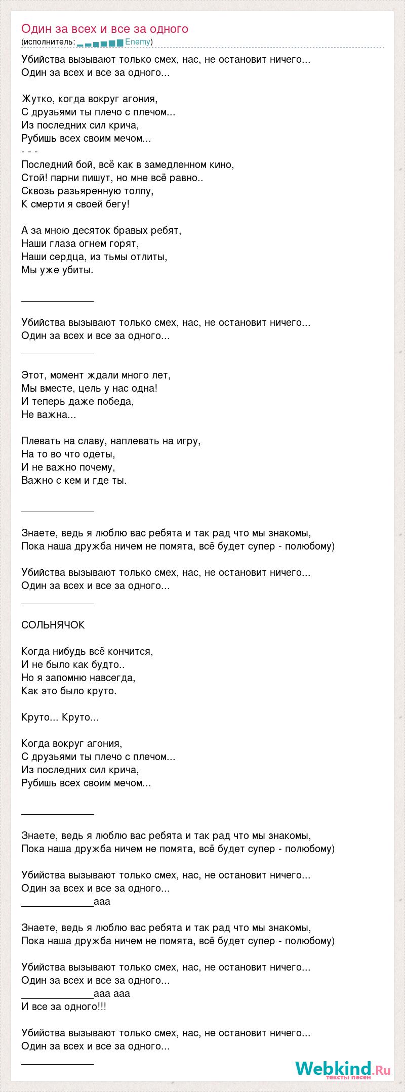 Убийства вызывают только смех, нас, не остановит ничего... Один за всех и все за одного... Жутко, когда вокруг агония, С друзьями ты плечо с плечом... Из последних сил крича, Рубишь всех своим мечом... - - - Последний бой, всё как в замедленном кино, Стой! парни пишут, но мне всё равно.. Сквозь разьяренную толпу, К смерти я своей бегу! А за мною десяток бравых ребят, Наши глаза огнем горят, Наши сердца, из тьмы отлиты, Мы уже убиты. _____________ Убийства вызывают только смех, нас, не остановит ничего... Один за всех и все за одного... _____________ Этот, момент ждали много лет, Мы вместе, цель у нас одна! И теперь даже победа, Не важна... Плевать на славу, наплевать на игру, На то во что одеты, И не важно почему, Важно с кем и где ты. _____________ Знаете, ведь я люблю вас ребята и так рад что мы знакомы, Пока наша дружба ничем не помята, всё будет супер - полюбому) Убийства вызывают только смех, нас, не остановит ничего... Один за всех и все за одного... _____________ СОЛЬНЯЧОК Когда нибудь всё кончится, И не было как будто.. Но я запомню навсегда, Как это было круто. Круто... Круто... Когда вокруг агония, С друзьями ты плечо с плечом... Из последних сил крича, Рубишь всех своим мечом... _____________ Знаете, ведь я люблю вас ребята и так рад что мы знакомы, Пока наша дружба ничем не помята, всё будет супер - полюбому) Убийства вызывают только смех, нас, не остановит ничего... Один за всех и все за одного... _____________ааа Знаете, ведь я люблю вас ребята и так рад что мы знакомы, Пока наша дружба ничем не помята, всё будет супер - полюбому) Убийства вызывают только смех, нас, не остановит ничего... Один за всех и все за одного... _____________ааа ааа И все за одного!!! Убийства вызывают только смех, нас, не остановит ничего... Один за всех и все за одного... _____________