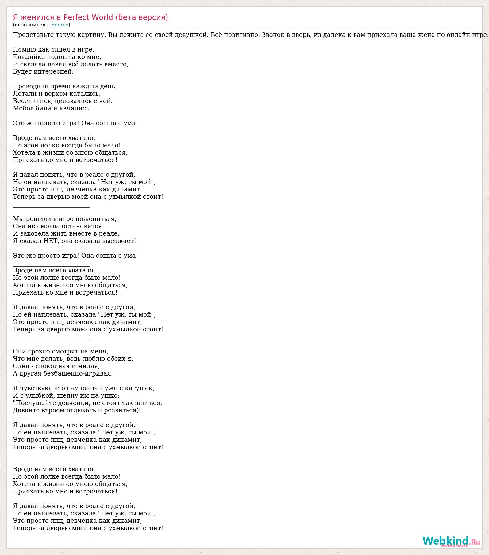 Представьте такую картину. Вы лежите со своей девушкой. Всё позитивно. Звонок в дверь, из далека к вам приехала ваша жена по онлайн игре. Помню как сидел в игре, Ельфийка подошла ко мне, И сказала давай всё делать вместе, Будет интересней. Проводили время каждый день, Летали и верхом катались, Веселились, целовались с ней. Мобов били и качались. Это же просто игра! Она сошла с ума! _________________________ Вроде нам всего хватало, Но этой лолке всегда было мало! Хотела в жизни со мною общаться, Приехать ко мне и встречаться! Я давал понять, что в реале с другой, Но ей наплевать, сказала "Нет уж, ты мой", Это просто ппц, девченка как динамит, Теперь за дверью моей она с ухмылкой стоит! _________________________ Мы решили в игре пожениться, Она не смогла остановится.. И захотела жить вместе в реале, Я сказал НЕТ, она сказала выезжает! Это же просто игра! Она сошла с ума! _________________________ Вроде нам всего хватало, Но этой лолке всегда было мало! Хотела в жизни со мною общаться, Приехать ко мне и встречаться! Я давал понять, что в реале с другой, Но ей наплевать, сказала "Нет уж, ты мой", Это просто ппц, девченка как динамит, Теперь за дверью моей она с ухмылкой стоит! _________________________ Они грозно смотрят на меня, Что мне делать, ведь люблю обеих я, Одна - спокойная и милая, А другая безбашенно-игривая. - - - Я чувствую, что сам слетел уже с катушек, И с улыбкой, шепну им на ушко: "Послушайте девченки, не стоит так злиться, Давайте втроем отдыхать и резвиться)" - - - - - Я давал понять, что в реале с другой, Но ей наплевать, сказала "Нет уж, ты мой", Это просто ппц, девченка как динамит, Теперь за дверью моей она с ухмылкой стоит! _________________________ Вроде нам всего хватало, Но этой лолке всегда было мало! Хотела в жизни со мною общаться, Приехать ко мне и встречаться! Я давал понять, что в реале с другой, Но ей наплевать, сказала "Нет уж, ты мой", Это просто ппц, девченка как динамит, Теперь за дверью моей она с ухмылкой стоит! _________________________