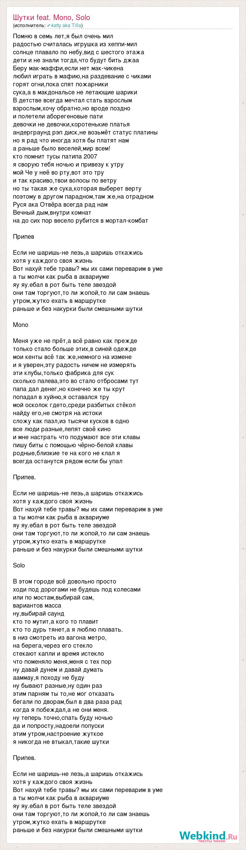 Помню в семь лет,я был очень мил радостью считалась игрушка из хеппи-мил солнце плавало по небу,вид с шестого этажа дети и не знали тогда,что будут бить джаа Беру мак-маффи,если нет мак-чикена любил играть в мафию,на раздевание с чиками горят огни,пока спят пожарники сука,а в макдональсе не летающие шарики В детстве всегда мечтал стать взрослым взрослым,хочу обратно,но вроде поздно и полетели аборегеновые пати девочки не девочки,коротенькие платья андерграунд рэп диск,не возьмёт статус платины но я рад что иногда хотя бы платят нам а раньше было веселей,мир всем! кто помнит тусы патипа 2007 я сворую тебя ночью и привезу к утру мой Че у неё во рту,вот это тру и так красиво,твои волосы по ветру но ты такая же сука,которая выберет верту поэтому в другом парадном,там же,на отрадном Руся ака Отвёра всегда рад нам Вечный дым,внутри комнат на до сих пор весело рубится в мортал-комбат Припев Если не шаришь-не лезь,а шаришь откажись хотя у каждого своя жизнь Вот нахуй тебе травы? мы их сами переварим в уме а ты молчи как рыба в аквариуме яу яу.ебал в рот быть теле звездой они там торгуют,то ли жопой,то ли сам знаешь утром,жутко ехать в маршрутке раньше и без накурки были смешными шутки Mono Меня уже не прёт,а всё равно как прежде только стало больше этих,в синей одежде мои кенты всё так же,немного на измене и я уверен,эту радость ничем не измерять эти клубы,только фабрика для сук сколько палева,это во стало отбросами тут папа дал денег,но конечно же ты крут попадал в хуйню,я оставался тру мой осколок гдето,среди разбитых стёкол найду его,не смотря на истоки сложу как пазл,из тысячи кусков в одно все люди разные,лепят своё кино и мне настрать что подумают все эти клавы пишу биты с помощью чёрно-белой клавы родные,близкие те на кого не клал я всегда останутся рядом если бы упал Припев. Если не шаришь-не лезь,а шаришь откажись хотя у каждого своя жизнь Вот нахуй тебе травы? мы их сами переварим в уме а ты молчи как рыба в аквариуме яу яу.ебал в рот быть теле звездой они там торгуют,то ли жопой,то ли сам знаешь утром,жутко ехать в маршрутке раньше и без накурки были смешными шутки Solo В этом городе всё довольно просто ходи под дорогами не будешь под колесами или по мостам,выбирай сам, вариантов масса ну,выбирай саунд кто то мутит,а кого то плавит кто то дурь тянет,а я люблю плавать. в низ смотреть из вагона метро, на берега,через его стекло стекают капли и время истекло что поменяло меня,меня с тех пор ну давай дунем и давай думать ааммау,я походу не буду ну бывают разные,ну один раз этим парням ты то,не мог отказать бегали по дворам,был в два раза рад когда я побеждал,а не они меня. ну теперь точно,спать буду ночью да и попросту,надоели попуски этим утром,настроение жуткое я никогда не втыкал,такие шутки Припев. Если не шаришь-не лезь,а шаришь откажись хотя у каждого своя жизнь Вот нахуй тебе травы? мы их сами переварим в уме а ты молчи как рыба в аквариуме яу яу.ебал в рот быть теле звездой они там торгуют,то ли жопой,то ли сам знаешь утром,жутко ехать в маршрутке раньше и без накурки были смешными шутки