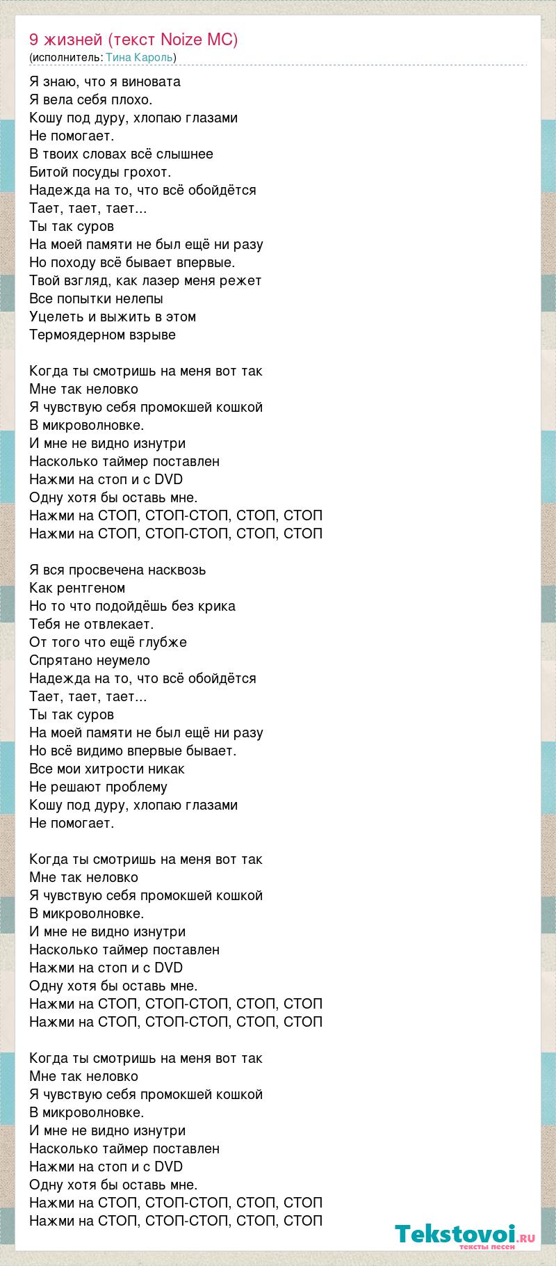 Я знаю, что я виновата Я вела себя плохо. Кошу под дуру, хлопаю глазами Не помогает. В твоих словах всё слышнее Битой посуды грохот. Надежда на то, что всё обойдётся Тает, тает, тает... Ты так суров На моей памяти не был ещё ни разу Но походу всё бывает впервые. Твой взгляд, как лазер меня режет Все попытки нелепы Уцелеть и выжить в этом Термоядерном взрыве Когда ты смотришь на меня вот так Мне так неловко Я чувствую себя промокшей кошкой В микроволновке. И мне не видно изнутри Насколько таймер поставлен Нажми на стоп и с DVD Одну хотя бы оставь мне. Нажми на СТОП, СТОП-СТОП, СТОП, СТОП Нажми на СТОП, СТОП-СТОП, СТОП, СТОП Я вся просвечена насквозь Как рентгеном Но то что подойдёшь без крика Тебя не отвлекает. От того что ещё глубже Спрятано неумело Надежда на то, что всё обойдётся Тает, тает, тает... Ты так суров На моей памяти не был ещё ни разу Но всё видимо впервые бывает. Все мои хитрости никак Не решают проблему Кошу под дуру, хлопаю глазами Не помогает. Когда ты смотришь на меня вот так Мне так неловко Я чувствую себя промокшей кошкой В микроволновке. И мне не видно изнутри Насколько таймер поставлен Нажми на стоп и с DVD Одну хотя бы оставь мне. Нажми на СТОП, СТОП-СТОП, СТОП, СТОП Нажми на СТОП, СТОП-СТОП, СТОП, СТОП Когда ты смотришь на меня вот так Мне так неловко Я чувствую себя промокшей кошкой В микроволновке. И мне не видно изнутри Насколько таймер поставлен Нажми на стоп и с DVD Одну хотя бы оставь мне. Нажми на СТОП, СТОП-СТОП, СТОП, СТОП Нажми на СТОП, СТОП-СТОП, СТОП, СТОП