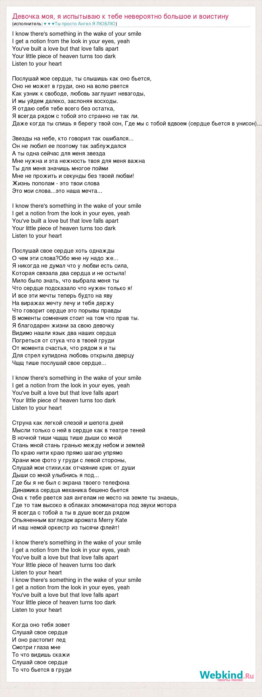 I know there's something in the wake of your smile I get a notion from the look in your eyes, yeah You've built a love but that love falls apart Your little piece of heaven turns too dark Listen to your heart Послушай мое сердце, ты слышишь как оно бьется, Оно не может в груди, оно на волю рвется Как узник к свободе, любовь заглушит невзгоды, И мы уйдем далеко, заслоняя восходы. Я отдаю себя тебе всего без остатка, Я всегда рядом с тобой это странно не так ли. Даже когда ты спишь я берегу твой сон, Где мы с тобой вдвоем (сердце бьется в унисон)... Звезды на небе, кто говорил так ошибался... Он не любил ее поэтому так заблуждался А ты одна сейчас для меня звезда Мне нужна и эта нежность твоя для меня важна Ты для меня значишь многое пойми Мне не прожить и секунды без твоей любви! Жизнь пополам - это твои слова Это мои слова...это наша мечта... I know there's something in the wake of your smile I get a notion from the look in your eyes, yeah You've built a love but that love falls apart Your little piece of heaven turns too dark Listen to your heart Послушай свое сердце хоть однажды О чем эти слова?Обо мне ну надо же... Я никогда не думал что у любви есть сила, Которая связала два сердца и не остыла! Мило было знать, что выбрала меня ты Что сердце подсказало что нужен только я! И все эти мечты теперь будто на яву На виражах мечту лечу и тебя держу Что говорит сердце это порывы правды В моменты сомнения стоит на том что прав ты. Я благодарен жизни за свою девочку Видимо нашли язык два наших сердца Погреться от стука что в твоей груди От момента счастья, что рядом я и ты Для стрел купидона любовь открыла дверцу Чщщ тише послушай свое сердце... I know there's something in the wake of your smile I get a notion from the look in your eyes, yeah You've built a love but that love falls apart Your little piece of heaven turns too dark Listen to your heart Струна как легкой слезой и шепота дней Мысли только о ней в сердце как в театре теней В ночной тиши чщщщ тише дыши со мной Стань мной стань гранью между небом и землей По краю нити краю прямо шагаю упрямо Храни мое фото у груди с левой стороны, Слушай мои стихи,как отчаяние крик от души Дыши со мной улыбнись я под... Где бы я не был с экрана твоего телефона Динамика сердца механика бешено бьется Она к тебе рвется зая ангелам не место на земле ты знаешь, Где то там высоко в облаках элюминатора под звуки мотора Я всегда с тобой а ты в душе всегда рядом Опьяненным взглядом аромата Merry Kate И наш немой оркестр из тысячи флейт! I know there's something in the wake of your smile I get a notion from the look in your eyes, yeah You've built a love but that love falls apart Your little piece of heaven turns too dark Listen to your heart I know there's something in the wake of your smile I get a notion from the look in your eyes, yeah You've built a love but that love falls apart Your little piece of heaven turns too dark Listen to your heart Когда оно тебя зовет Слушай свое сердце И оно растопит лед Смотри глаза мне То что видишь скажи Слушай свое сердце То что бьется в груди