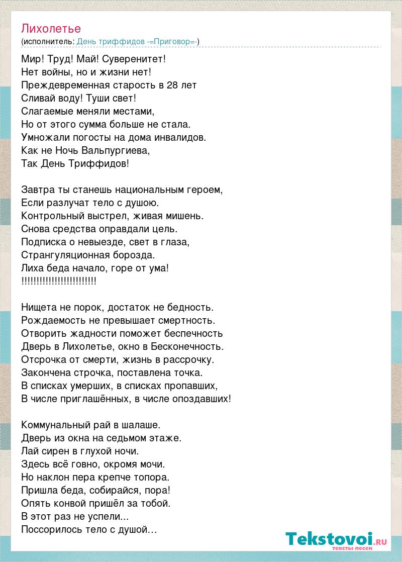 Мир! Труд! Май! Суверенитет! Нет войны, но и жизни нет! Преждевременная старость в 28 лет Сливай воду! Туши свет! Слагаемые меняли местами, Но от этого сумма больше не стала. Умножали погосты на дома инвалидов. Как не Ночь Вальпургиева, Так День Триффидов! Завтра ты станешь национальным героем, Если разлучат тело с душою. Контрольный выстрел, живая мишень. Снова средства оправдали цель. Подписка о невыезде, свет в глаза, Странгуляционная борозда. Лиха беда начало, горе от ума! !!!!!!!!!!!!!!!!!!!!!!!!! Нищета не порок, достаток не бедность. Рождаемость не превышает смертность. Отворить жадности поможет беспечность Дверь в Лихолетье, окно в Бесконечность. Отсрочка от смерти, жизнь в рассрочку. Закончена строчка, поставлена точка. В списках умерших, в списках пропавших, В числе приглашённых, в числе опоздавших! Коммунальный рай в шалаше. Дверь из окна на седьмом этаже. Лай сирен в глухой ночи. Здесь всё говно, окромя мочи. Но наклон пера крепче топора. Пришла беда, собирайся, пора! Опять конвой пришёл за тобой. В этот раз не успели... Поссорилось тело с душой…