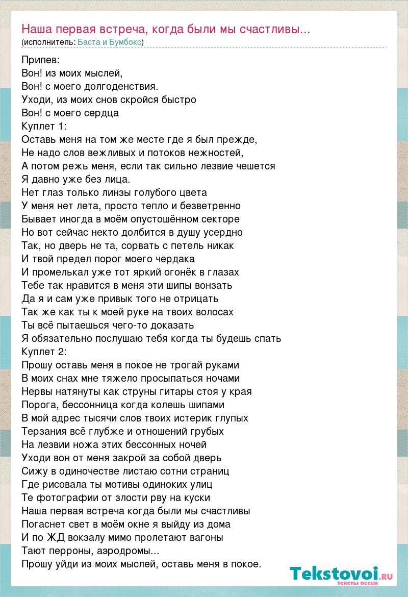 Припев: Вон! из моих мыслей, Вон! с моего долгоденствия. Уходи, из моих снов скройся быстро Вон! с моего сердца Куплет 1: Оставь меня на том же месте где я был прежде, Не надо слов вежливых и потоков нежностей, А потом режь меня, если так сильно лезвие чешется Я давно уже без лица. Нет глаз только линзы голубого цвета У меня нет лета, просто тепло и безветренно Бывает иногда в моём опустошённом секторе Но вот сейчас некто долбится в душу усердно Так, но дверь не та, сорвать с петель никак И твой предел порог моего чердака И промелькал уже тот яркий огонёк в глазах Тебе так нравится в меня эти шипы вонзать Да я и сам уже привык того не отрицать Так же как ты к моей руке на твоих волосах Ты всё пытаешься чего-то доказать Я обязательно послушаю тебя когда ты будешь спать Куплет 2: Прошу оставь меня в покое не трогай руками В моих снах мне тяжело просыпаться ночами Нервы натянуты как струны гитары стоя у края Порога, бессонница когда колешь шипами В мой адрес тысячи слов твоих истерик глупых Терзания всё глубже и отношений грубых На лезвии ножа этих бессонных ночей Уходи вон от меня закрой за собой дверь Сижу в одиночестве листаю сотни страниц Где рисовала ты мотивы одиноких улиц Те фотографии от злости рву на куски Наша первая встреча когда были мы счастливы Погаснет свет в моём окне я выйду из дома И по ЖД вокзалу мимо пролетают вагоны Тают перроны, аэродромы... Прошу уйди из моих мыслей, оставь меня в покое.