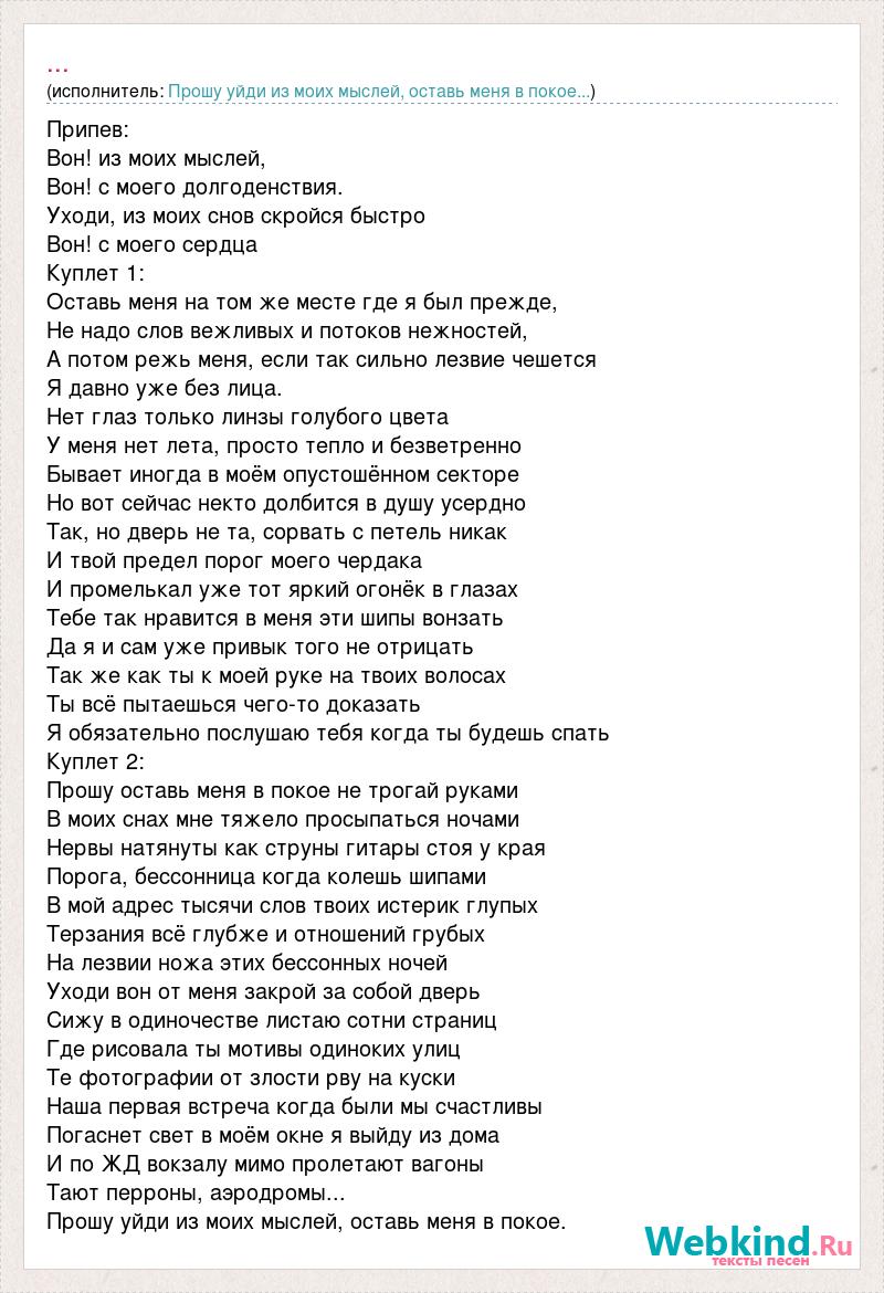 Припев: Вон! из моих мыслей, Вон! с моего долгоденствия. Уходи, из моих снов скройся быстро Вон! с моего сердца Куплет 1: Оставь меня на том же месте где я был прежде, Не надо слов вежливых и потоков нежностей, А потом режь меня, если так сильно лезвие чешется Я давно уже без лица. Нет глаз только линзы голубого цвета У меня нет лета, просто тепло и безветренно Бывает иногда в моём опустошённом секторе Но вот сейчас некто долбится в душу усердно Так, но дверь не та, сорвать с петель никак И твой предел порог моего чердака И промелькал уже тот яркий огонёк в глазах Тебе так нравится в меня эти шипы вонзать Да я и сам уже привык того не отрицать Так же как ты к моей руке на твоих волосах Ты всё пытаешься чего-то доказать Я обязательно послушаю тебя когда ты будешь спать Куплет 2: Прошу оставь меня в покое не трогай руками В моих снах мне тяжело просыпаться ночами Нервы натянуты как струны гитары стоя у края Порога, бессонница когда колешь шипами В мой адрес тысячи слов твоих истерик глупых Терзания всё глубже и отношений грубых На лезвии ножа этих бессонных ночей Уходи вон от меня закрой за собой дверь Сижу в одиночестве листаю сотни страниц Где рисовала ты мотивы одиноких улиц Те фотографии от злости рву на куски Наша первая встреча когда были мы счастливы Погаснет свет в моём окне я выйду из дома И по ЖД вокзалу мимо пролетают вагоны Тают перроны, аэродромы... Прошу уйди из моих мыслей, оставь меня в покое.