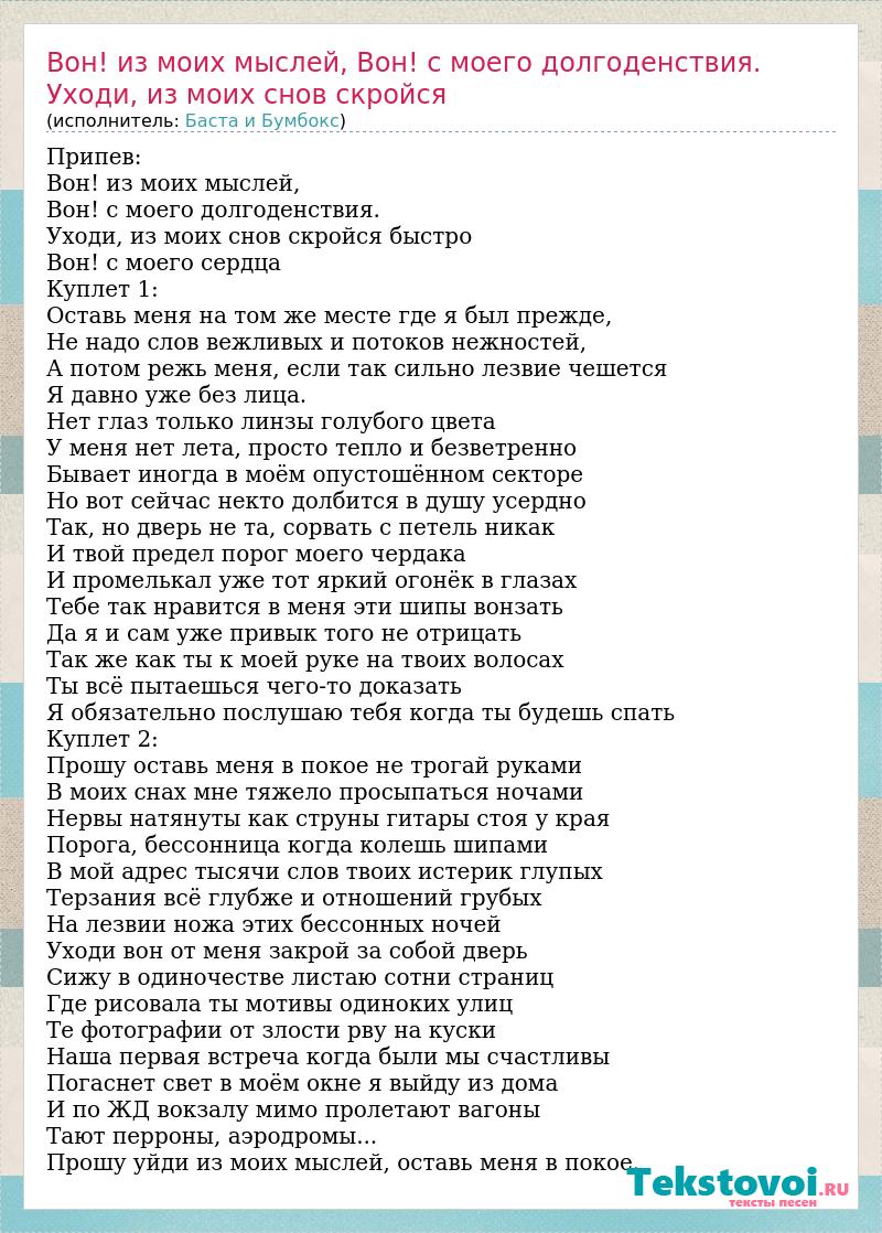 Припев: Вон! из моих мыслей, Вон! с моего долгоденствия. Уходи, из моих снов скройся быстро Вон! с моего сердца Куплет 1: Оставь меня на том же месте где я был прежде, Не надо слов вежливых и потоков нежностей, А потом режь меня, если так сильно лезвие чешется Я давно уже без лица. Нет глаз только линзы голубого цвета У меня нет лета, просто тепло и безветренно Бывает иногда в моём опустошённом секторе Но вот сейчас некто долбится в душу усердно Так, но дверь не та, сорвать с петель никак И твой предел порог моего чердака И промелькал уже тот яркий огонёк в глазах Тебе так нравится в меня эти шипы вонзать Да я и сам уже привык того не отрицать Так же как ты к моей руке на твоих волосах Ты всё пытаешься чего-то доказать Я обязательно послушаю тебя когда ты будешь спать Куплет 2: Прошу оставь меня в покое не трогай руками В моих снах мне тяжело просыпаться ночами Нервы натянуты как струны гитары стоя у края Порога, бессонница когда колешь шипами В мой адрес тысячи слов твоих истерик глупых Терзания всё глубже и отношений грубых На лезвии ножа этих бессонных ночей Уходи вон от меня закрой за собой дверь Сижу в одиночестве листаю сотни страниц Где рисовала ты мотивы одиноких улиц Те фотографии от злости рву на куски Наша первая встреча когда были мы счастливы Погаснет свет в моём окне я выйду из дома И по ЖД вокзалу мимо пролетают вагоны Тают перроны, аэродромы... Прошу уйди из моих мыслей, оставь меня в покое.