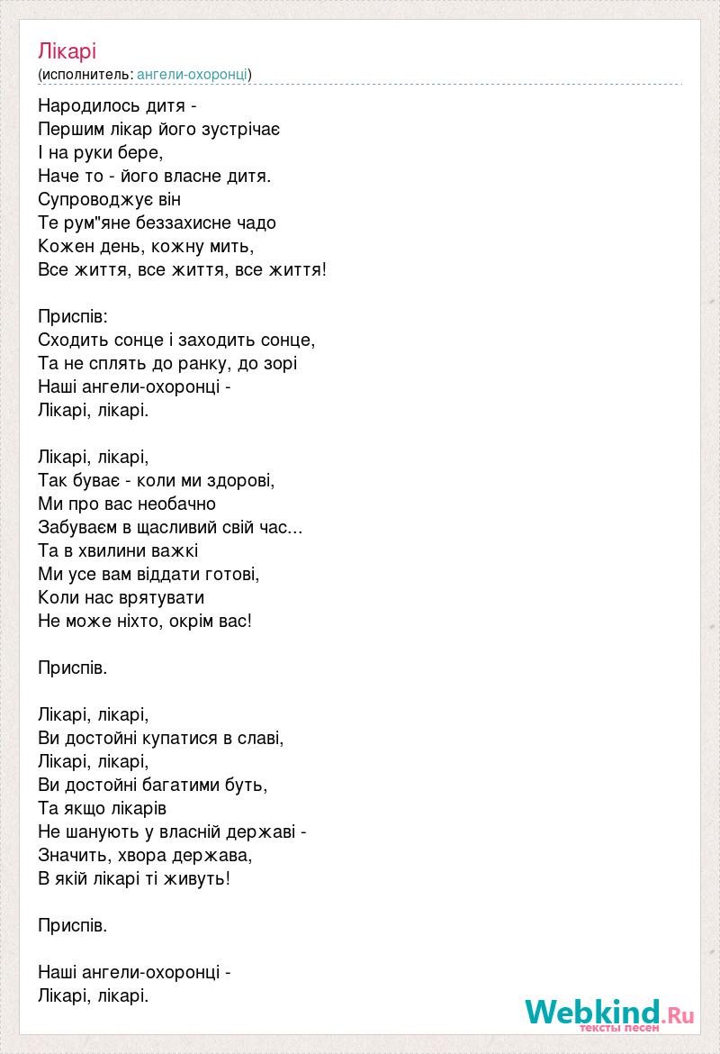 Народилось дитя - Першим лікар його зустрічає І на руки бере, Наче то - його власне дитя. Супроводжує він Те рум"яне беззахисне чадо Кожен день, кожну мить, Все життя, все життя, все життя! Приспів: Сходить сонце і заходить сонце, Та не сплять до ранку, до зорі Наші ангели-охоронці - Лікарі, лікарі. Лікарі, лікарі, Так буває - коли ми здорові, Ми про вас необачно Забуваєм в щасливий свій час... Та в хвилини важкі Ми усе вам віддати готові, Коли нас врятувати Не може ніхто, окрім вас! Приспів. Лікарі, лікарі, Ви достойні купатися в славі, Лікарі, лікарі, Ви достойні багатими буть, Та якщо лікарів Не шанують у власній державі - Значить, хвора держава, В якій лікарі ті живуть! Приспів. Наші ангели-охоронці - Лікарі, лікарі.