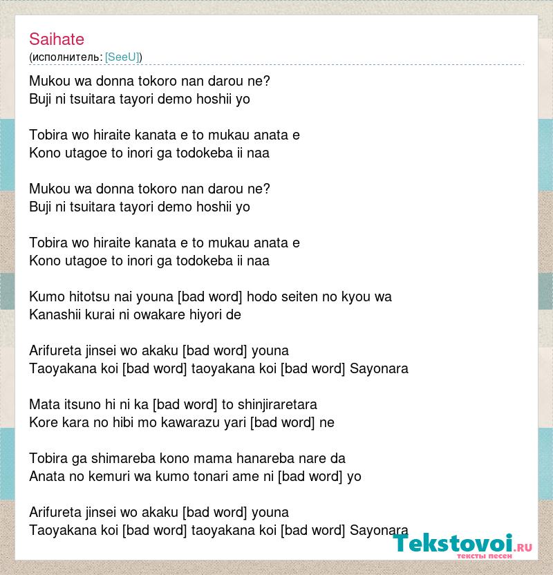 Mukou wa donna tokoro nan darou ne? Buji ni tsuitara tayori demo hoshii yo Tobira wo hiraite kanata e to mukau anata e Kono utagoe to inori ga todokeba ii naa Mukou wa donna tokoro nan darou ne? Buji ni tsuitara tayori demo hoshii yo Tobira wo hiraite kanata e to mukau anata e Kono utagoe to inori ga todokeba ii naa Kumo hitotsu nai youna nukeru hodo seiten no kyou wa Kanashii kurai ni owakare hiyori de Arifureta jinsei wo akaku irozukeru youna Taoyakana koi [bad word] taoyakana koi [bad word] Sayonara Mata itsuno hi ni ka deaeru to shinjiraretara Kore kara no hibi mo kawarazu yari sugoseru ne Tobira ga shimareba kono mama hanareba nare da Anata no kemuri wa kumo tonari ame ni naru yo Arifureta jinsei wo akaku irozukeru youna Taoyakana koi [bad word] taoyakana koi [bad word] Sayonara