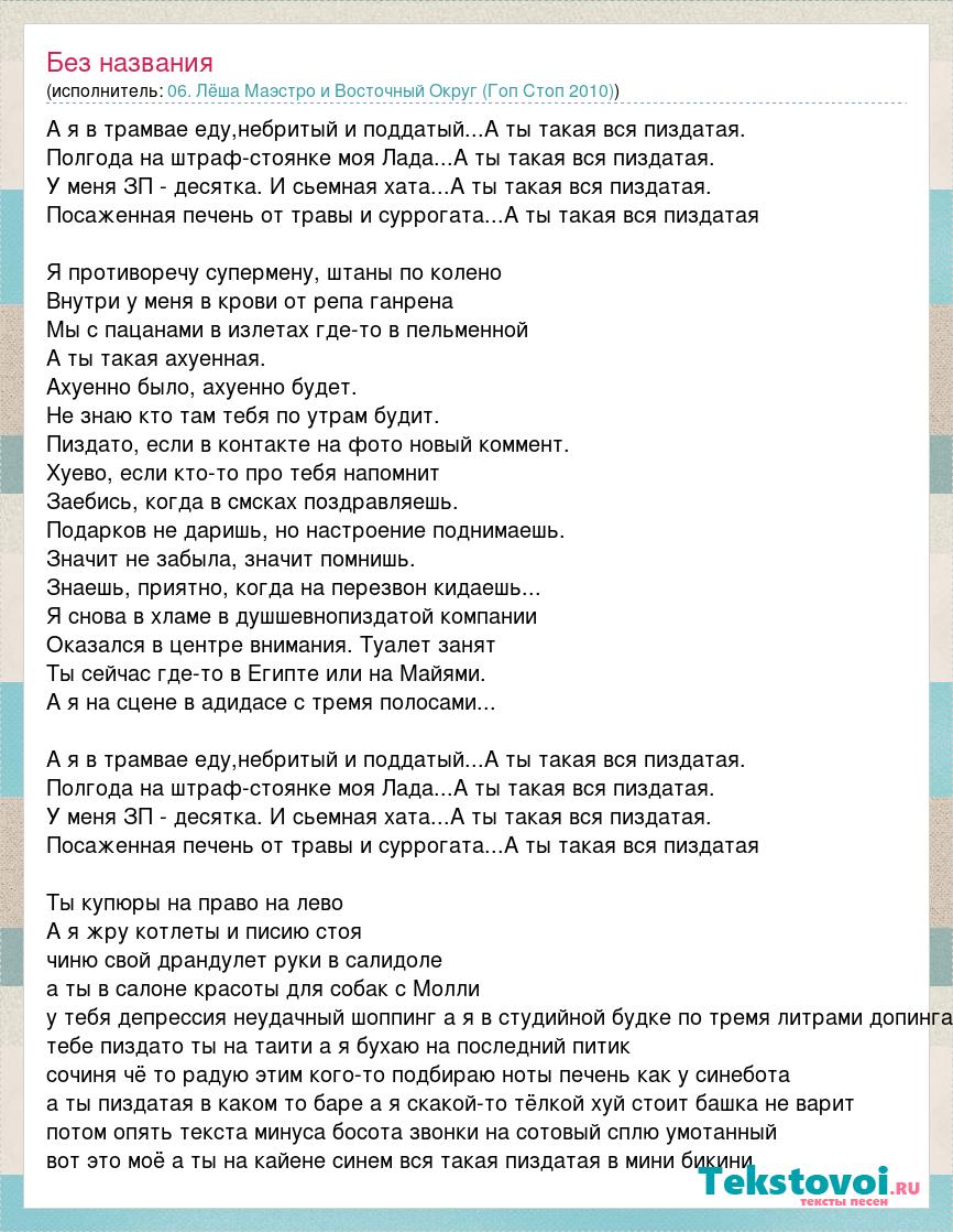 А я в трамвае еду,небритый и поддатый...А ты такая вся пиздатая. Полгода на штраф-стоянке моя Лада...А ты такая вся пиздатая. У меня ЗП - десятка. И сьемная хата...А ты такая вся пиздатая. Посаженная печень от травы и суррогата...А ты такая вся пиздатая Я противоречу супермену, штаны по колено Внутри у меня в крови от репа ганрена Мы с пацанами в излетах где-то в пельменной А ты такая ахуенная. Ахуенно было, ахуенно будет. Не знаю кто там тебя по утрам будит. Пиздато, если в контакте на фото новый коммент. Хуево, если кто-то про тебя напомнит Заебись, когда в смсках поздравляешь. Подарков не даришь, но настроение поднимаешь. Значит не забыла, значит помнишь. Знаешь, приятно, когда на перезвон кидаешь... Я снова в хламе в душшевнопиздатой компании Оказался в центре внимания. Туалет занят Ты сейчас где-то в Египте или на Майями. А я на сцене в адидасе с тремя полосами... А я в трамвае еду,небритый и поддатый...А ты такая вся пиздатая. Полгода на штраф-стоянке моя Лада...А ты такая вся пиздатая. У меня ЗП - десятка. И сьемная хата...А ты такая вся пиздатая. Посаженная печень от травы и суррогата...А ты такая вся пиздатая Ты купюры на право на лево А я жру котлеты и писию стоя чиню свой драндулет руки в салидоле а ты в салоне красоты для собак с Молли у тебя депрессия неудачный шоппинг а я в студийной будке по тремя литрами допинга тебе пиздато ты на таити а я бухаю на последний питик сочиня чё то радую этим кого-то подбираю ноты печень как у синебота а ты пиздатая в каком то баре а я скакой-то тёлкой хуй стоит башка не варит потом опять текста минуса босота звонки на сотовый сплю умотанный вот это моё а ты на кайене синем вся такая пиздатая в мини бикини
