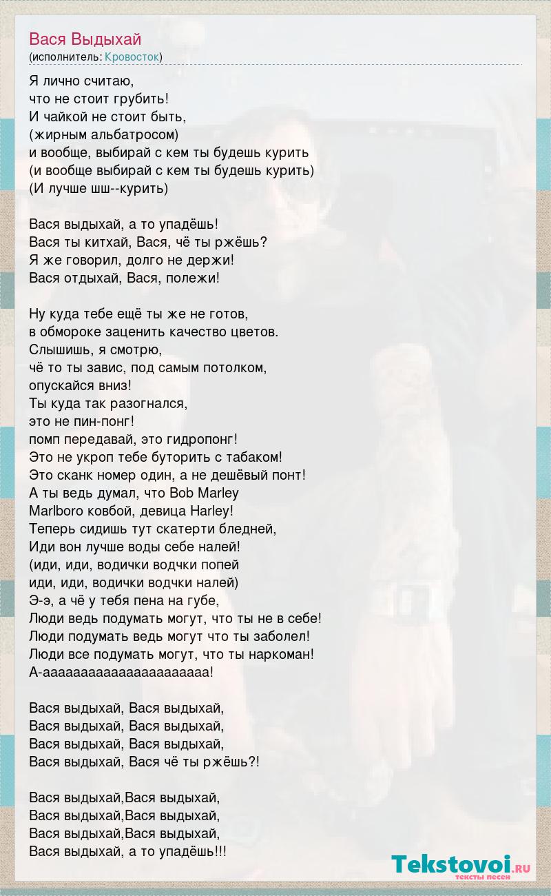 Я лично считаю, что не стоит грубить! И чайкой не стоит быть, (жирным альбатросом) и вообще, выбирай с кем ты будешь курить (и вообще выбирай с кем ты будешь курить) (И лучше шш--курить) Вася выдыхай, а то упадёшь! Вася ты китхай, Вася, чё ты ржёшь? Я же говорил, долго не держи! Вася отдыхай, Вася, полежи! Ну куда тебе ещё ты же не готов, в обмороке заценить качество цветов. Слышишь, я смотрю, чё то ты завис, под самым потолком, опускайся вниз! Ты куда так разогнался, это не пин-понг! помп передавай, это гидропонг! Это не укроп тебе буторить с табаком! Это сканк номер один, а не дешёвый понт! А ты ведь думал, что Bob Marley Marlboro ковбой, девица Harley! Теперь сидишь тут скатерти бледней, Иди вон лучше воды себе налей! (иди, иди, водички водчки попей иди, иди, водички водчки налей) Э-э, а чё у тебя пена на губе, Люди ведь подумать могут, что ты не в себе! Люди подумать ведь могут что ты заболел! Люди все подумать могут, что ты наркоман! А-аааааааааааааааааааааа! Вася выдыхай, Вася выдыхай, Вася выдыхай, Вася выдыхай, Вася выдыхай, Вася выдыхай, Вася выдыхай, Вася чё ты ржёшь?! Вася выдыхай,Вася выдыхай, Вася выдыхай,Вася выдыхай, Вася выдыхай,Вася выдыхай, Вася выдыхай, а то упадёшь!!!
