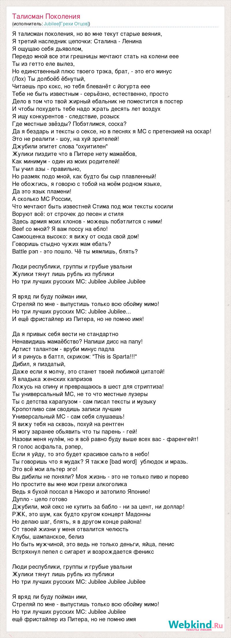 Я талисман поколения, но во мне текут старые веяния, Я третий наследник цепочки: Сталина - Ленина Я ощущаю себя дьяволом, Передо мной все эти грешницы мечтают стать на колени еее Ты из гетто еле вылез, Но единственный плюс твоего трэка, брат, - это его минус (Лох) Ты долбоёб ёбнутый, Читаешь про кокс, но тебя блеванёт с йогурта еее Тебе не быть известным - серьёзно, естественно, просто Дело в том что твой жирный ебальник не поместится в постер И чтобы похудеть тебе надо жрать десять лет воздух Я ищу конкурентов - следствие, розыск Где местные звёзды? Побэтлимся, соска? Да я бездарь и тексты о сексе, но в песнях я МС с претензией на оскар! Это не реалити - шоу, на хуй зрителей! Джубили эпитет слова "охуитилен" Жулики пиздите что в Питере нету мамаёбов, Как минимум - один из моих родителей! Ты учил азы - правильно, Но размяк подо мной, как будто бы сыр плавленный! Не обожгись, я говорю с тобой на моём родном языке, Да это язык пламени! А сколько МС России, Что мечтают быть известней Стима под мои тексты косили Воруют всё: от строчек до песен и стиля Здесь армия моих клонов - можешь побэтлится с ними! Beef со мной? Я вам поссу на ебло! Самооценка высоко: я вижу от сюда свой дом! Говоришь стыдно чужих мам ебать? Battle рэп - это пошло. Чё ты мямлишь, блять? Люди республики, группы и грубые увальни Жулики тянут лишь рубль из публики Но три лучших русских МС: Jubilee Jubilee Jubilee Я вряд ли буду пойман ими, Стреляй по мне - выпустишь только всю обойму мимо! Но три лучших русских МС: Jubilee Jubilee... И ещё фристайлер из Питера, но не помню имя! Да я привык себя вести не стандартно Ненавидишь мамаёбство? Напиши дисс на папу! Артист талантом - вруби минус падла И я ринусь в баттл, скриком: "This is Sparta!!!" Дибил, я пиздатый, Даже если я молчу, это станет твоей любимой цитатой! Я владыка женских капризов Ложусь на спину и превращаюсь в шест для стриптиза! Ты универсальный МС, не то что местные лузеры Ты с детства карапузом - сам писал тексты и музыку Кропотливо сам сводишь записи лучшие Универсальный МС - сам себя слушаешь! Я вижу тебя на сквозь, похуй на рентген Я могу заранее обьявить что ты парень - гей! Назови меня нулём, но я всё равно буду выше всех вас - фаренгейт! Я голос асфальта, рэпер, Если я уйду, то это будет красивое сальто в небо! Ты говоришь что я мудак? Я также [bad word] ублюдок и мразь. Это всё мои альтер эго! Вы дибилы не поняли? Моя жизнь - это не только пиво и порево Но простите вы мне мои грехи алкоголика Ведь я бухой поссал в Никоро и затопило Японию! Дупло - цело готово Джубили, мой секс не купить за бабло - ни за цент, ни доллар! РЖК, это шум, как будто кругом концерт Мадонны Но делаю шаг, блять, я в другом конце района! От твоей жизни у меня отвалится челюсть Клубы, шампанское, белиз Но быть мужчиной, это ведь не только деньги, яйца, пенис Встряхнул пепел с сигарет и возрождается феникс Люди республики, группы и грубые увальни Жулики тянут лишь рубль из публики Но три лучших русских МС: Jubilee Jubilee Jubilee Я вряд ли буду пойман ими, Стреляй по мне - выпустишь только всю обойму мимо! Но три лучших русских МС: Jubilee Jubilee ещё фристайлер из Питера, но не помню имя