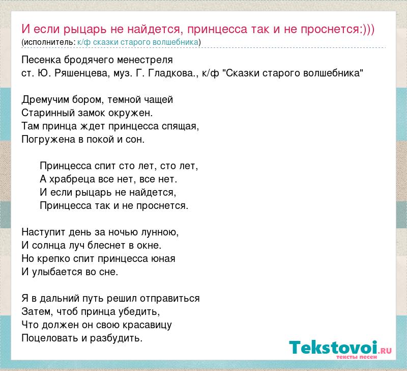 А как ты думаешь, о чем песня "И если рыцарь не найдется, принцесса так и не проснется:)))" ?