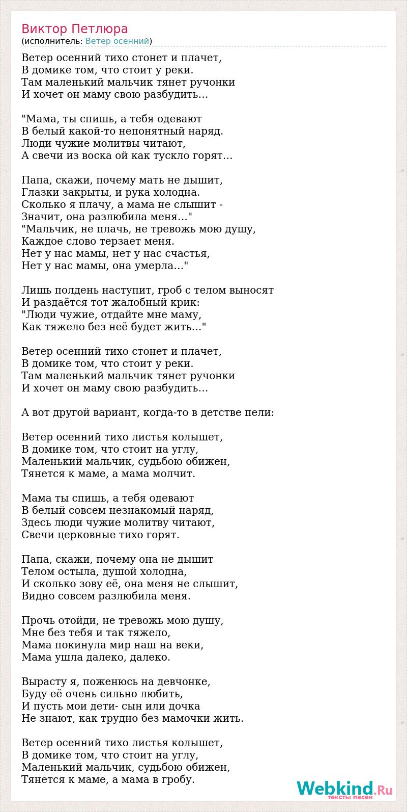 Ветер осенний тихо стонет и плачет, В домике том, что стоит у реки. Там маленький мальчик тянет ручонки И хочет он маму свою разбудить… "Мама, ты спишь, а тебя одевают В белый какой-то непонятный наряд. Люди чужие молитвы читают, А свечи из воска ой как тускло горят… Папа, скажи, почему мать не дышит, Глазки закрыты, и рука холодна. Сколько я плачу, а мама не слышит - Значит, она разлюбила меня…" "Мальчик, не плачь, не тревожь мою душу, Каждое слово терзает меня. Нет у нас мамы, нет у нас счастья, Нет у нас мамы, она умерла…" Лишь полдень наступит, гроб с телом выносят И раздаётся тот жалобный крик: "Люди чужие, отдайте мне маму, Как тяжело без неё будет жить…" Ветер осенний тихо стонет и плачет, В домике том, что стоит у реки. Там маленький мальчик тянет ручонки И хочет он маму свою разбудить… А вот другой вариант, когда-то в детстве пели: Ветер осенний тихо листья колышет, В домике том, что стоит на углу, Маленький мальчик, судьбою обижен, Тянется к маме, а мама молчит. Мама ты спишь, а тебя одевают В белый совсем незнакомый наряд, Здесь люди чужие молитву читают, Свечи церковные тихо горят. Папа, скажи, почему она не дышит Телом остыла, душой холодна, И сколько зову её, она меня не слышит, Видно совсем разлюбила меня. Прочь отойди, не тревожь мою душу, Мне без тебя и так тяжело, Мама покинула мир наш на веки, Мама ушла далеко, далеко. Вырасту я, поженюсь на девчонке, Буду её очень сильно любить, И пусть мои дети- сын или дочка Не знают, как трудно без мамочки жить. Ветер осенний тихо листья колышет, В домике том, что стоит на углу, Маленький мальчик, судьбою обижен, Тянется к маме, а мама в гробу.