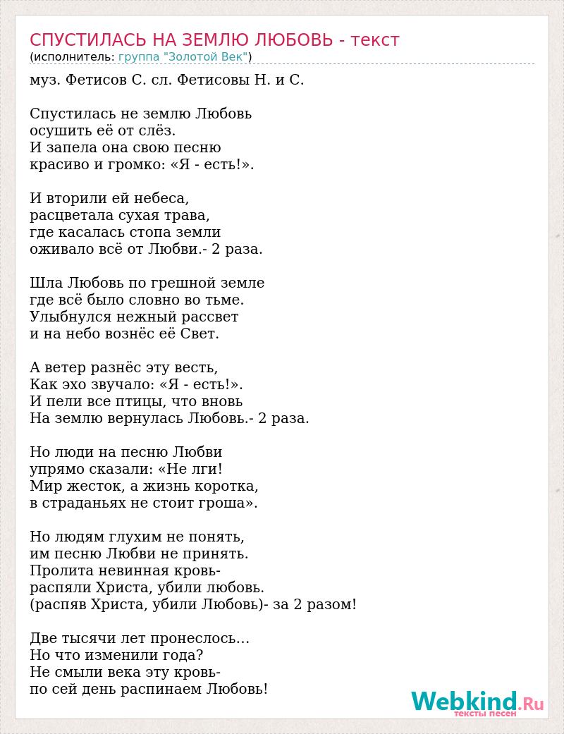 СПУСТИЛАСЬ НА ЗЕМЛЮ ЛЮБОВЬ - текст