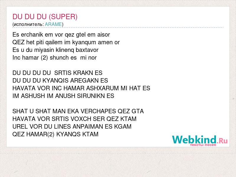 Es erchanik em vor qez gtel em aisor QEZ het piti qailem im kyanqum amen or Es u du miyasin klinenq baxtavor Inc hamar (2) shunch es mi nor DU DU DU DU SRTIS KRAKN ES DU DU DU KYANQIS AREGAKN ES HAVATA VOR INC HAMAR ASHXARUM MI HAT ES IM ASHUSH IM ANUSH SIRUNIKN ES SHAT U SHAT MAN EKA VERCHAPES QEZ GTA HAVATA VOR SRTIS VOXCH SER QEZ KTAM UREL VOR DU LINES ANPAIMAN ES KGAM QEZ HAMAR(2) KYANQS KTAM