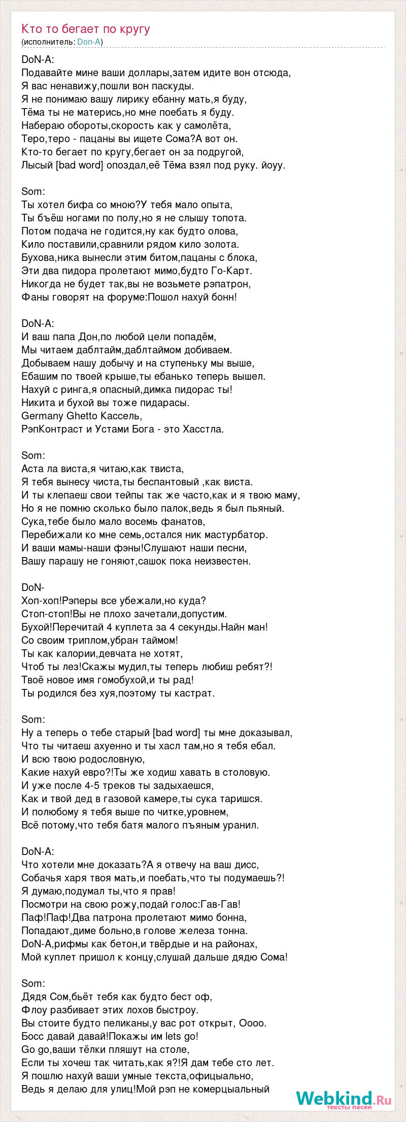 DoN-A: Подавайте мине ваши доллары,затем идите вон отсюда, Я вас ненавижу,пошли вон паскуды. Я не понимаю вашу лирику ебанну мать,я буду, Тёма ты не матерись,но мне поебать я буду. Набераю обороты,скорость как у самолёта, Теро,теро - пацаны вы ищете Сома?А вот он. Кто-то бегает по кругу,бегает он за подругой, Лысый [bad word] опоздал,её Тёма взял под руку. йоуу. Som: Ты хотел бифа со мною?У тебя мало опыта, Ты бъёш ногами по полу,но я не слышу топота. Потом подача не годится,ну как будто олова, Кило поставили,сравнили рядом кило золота. Бухова,ника вынесли этим битом,пацаны с блока, Эти два пидора пролетают мимо,будто Го-Карт. Никогда не будет так,вы не возьмете рэпатрон, Фаны говорят на форуме:Пошол нахуй бонн! DoN-A: И ваш папа Дон,по любой цели попадём, Мы читаем даблтайм,даблтаймом добиваем. Добываем нашу добычу и на ступеньку мы выше, Ебашим по твоей крыше,ты ебанько теперь вышел. Нахуй с ринга,я опасный,димка пидорас ты! Никита и бухой вы тоже пидарасы. Germany Ghetto Кассель, РэпКонтраст и Устами Бога - это Хасстла. Som: Аста ла виста,я читаю,как твиста, Я тебя вынесу чиста,ты беспантовый ,как виста. И ты клепаеш свои тейпы так же часто,как и я твою маму, Но я не помню сколько было палок,ведь я был пьяный. Сука,тебе было мало восемь фанатов, Перебижали ко мне семь,остался ник мастурбатор. И ваши мамы-наши фэны!Слушают наши песни, Вашу парашу не гоняют,сашок пока неизвестен. DoN- Хоп-хоп!Рэперы все убежали,но куда? Стоп-стоп!Вы не плохо зачетали,допустим. Бухой!Перечитай 4 куплета за 4 секунды.Найн ман! Со своим триплом,убран таймом! Ты как калории,девчата не хотят, Чтоб ты лез!Скажы мудил,ты теперь любиш ребят?! Твоё новое имя гомобухой,и ты рад! Ты родился без хуя,поэтому ты кастрат. Som: Ну а теперь о тебе старый [bad word] ты мне доказывал, Что ты читаеш ахуенно и ты хасл там,но я тебя ебал. И всю твою родословную, Какие нахуй евро?!Ты же ходиш хавать в столовую. И уже после 4-5 треков ты задыхаешся, Как и твой дед в газовой камере,ты сука таришся. И полюбому я тебя выше по читке,уровнем, Всё потому,что тебя батя малого пъяным уранил. DoN-A: Что хотели мне доказать?А я отвечу на ваш дисс, Собачья харя твоя мать,и поебать,что ты подумаешь?! Я думаю,подумал ты,что я прав! Посмотри на свою рожу,подай голос:Гав-Гав! Паф!Паф!Два патрона пролетают мимо бонна, Попадают,диме больно,в голове железа тонна. DoN-A,рифмы как бетон,и твёрдые и на районах, Мой куплет пришол к концу,слушай дальше дядю Сома! Som: Дядя Сом,бьёт тебя как будто бест оф, Флоу разбивает этих лохов быстроу. Вы стоите будто пеликаны,у вас рот открыт, Оооо. Босс давай давай!Покажы им lets go! Go go,ваши тёлки пляшут на столе, Если ты хочеш так читать,как я?!Я дам тебе сто лет. Я пошлю нахуй ваши умные текста,офицыально, Ведь я делаю для улиц!Мой рэп не комерцыальный