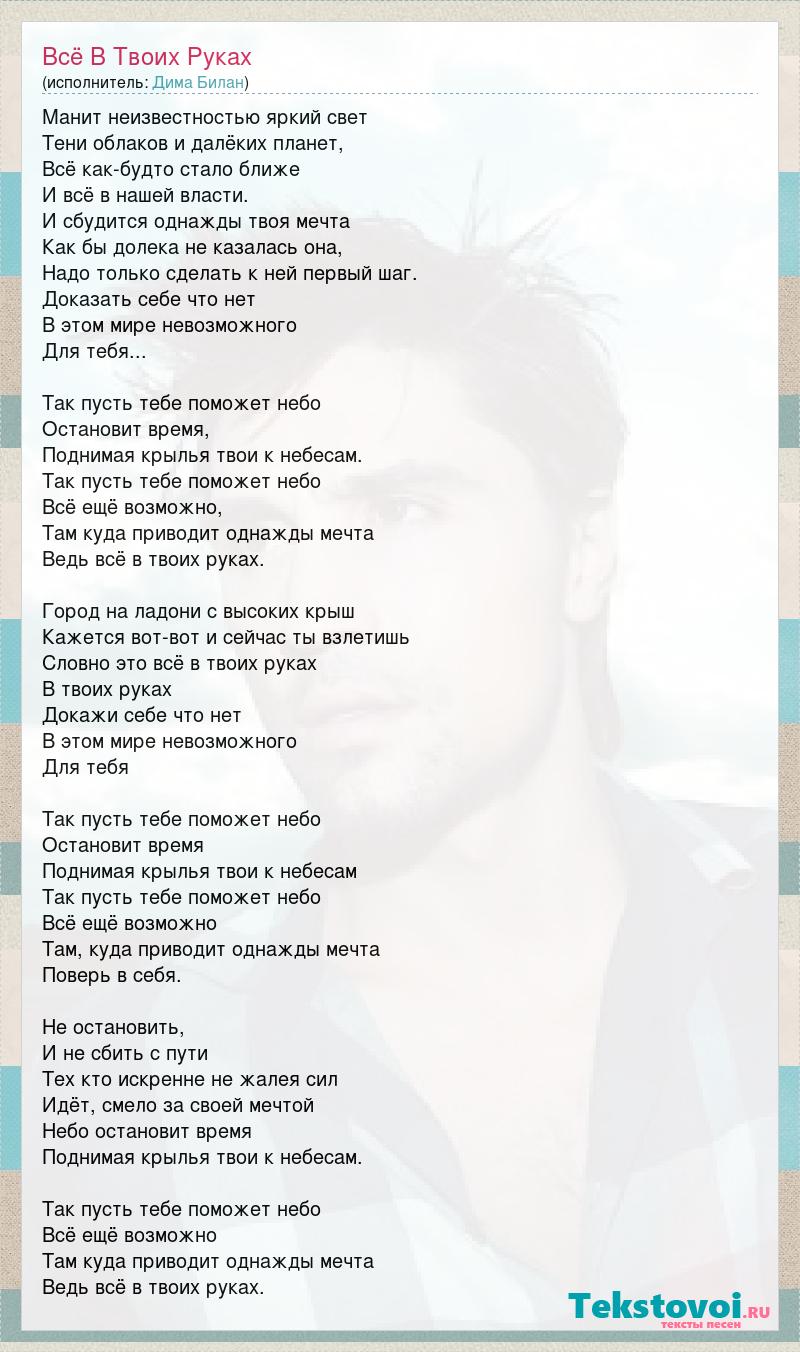 Манит неизвестностью яркий свет Тени облаков и далёких планет, Всё как-будто стало ближе И всё в нашей власти. И сбудится однажды твоя мечта Как бы долека не казалась она, Надо только сделать к ней первый шаг. Доказать себе что нет В этом мире невозможного Для тебя... Так пусть тебе поможет небо Остановит время, Поднимая крылья твои к небесам. Так пусть тебе поможет небо Всё ещё возможно, Там куда приводит однажды мечта Ведь всё в твоих руках. Город на ладони с высоких крыш Кажется вот-вот и сейчас ты взлетишь Словно это всё в твоих руках В твоих руках Докажи себе что нет В этом мире невозможного Для тебя Так пусть тебе поможет небо Остановит время Поднимая крылья твои к небесам Так пусть тебе поможет небо Всё ещё возможно Там, куда приводит однажды мечта Поверь в себя. Не остановить, И не сбить с пути Тех кто искренне не жалея сил Идёт, смело за своей мечтой Небо остановит время Поднимая крылья твои к небесам. Так пусть тебе поможет небо Всё ещё возможно Там куда приводит однажды мечта Ведь всё в твоих руках.