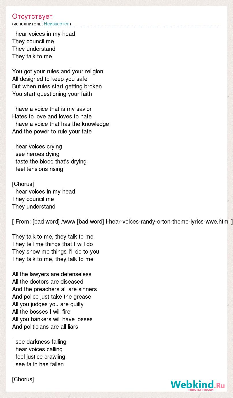 I hear voices in my head They council me They understand They talk to me You got your rules and your religion All designed to keep you safe But when rules start getting broken You start questioning your faith I have a voice that is my savior Hates to love and loves to hate I have a voice that has the knowledge And the power to rule your fate I hear voices crying I see heroes dying I taste the blood that's drying I feel tensions rising [Chorus] I hear voices in my head They council me They understand [ From: [bad word] /www [bad word] i-hear-voices-randy-orton-theme-lyrics-wwe.html ] They talk to me, they talk to me They tell me things that I will do They show me things I'll do to you They talk to me, they talk to me All the lawyers are defenseless All the doctors are diseased And the preachers all are sinners And police just take the grease All you judges you are guilty All the bosses I will fire All you bankers will have losses And politicians are all liars I see darkness falling I hear voices calling I feel justice crawling I see faith has fallen [Chorus]